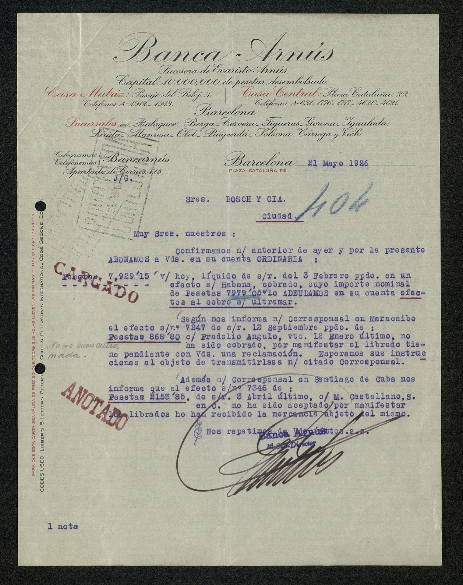 Escrito de Banca Arnús sobre abonos en cuenta de cobros de ultramar: Maracaibo y Santiago de Cuba