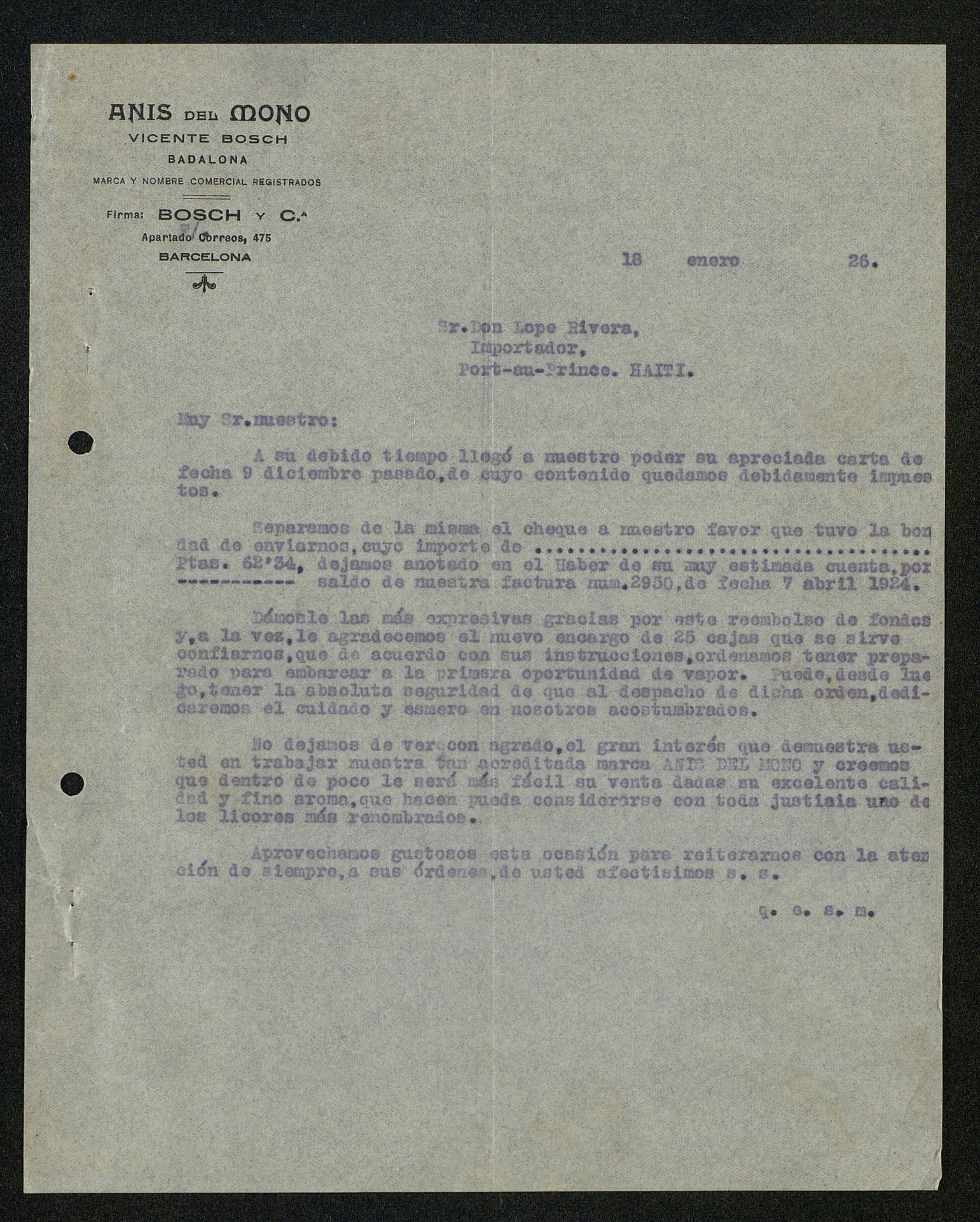 [Carta] 1924, de Vicente Bosch a Lope Rivera, Importador de Port-au-prince (Puerto Príncipe) Haití
