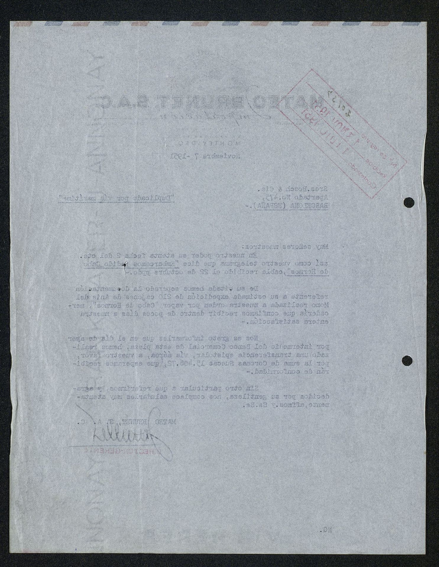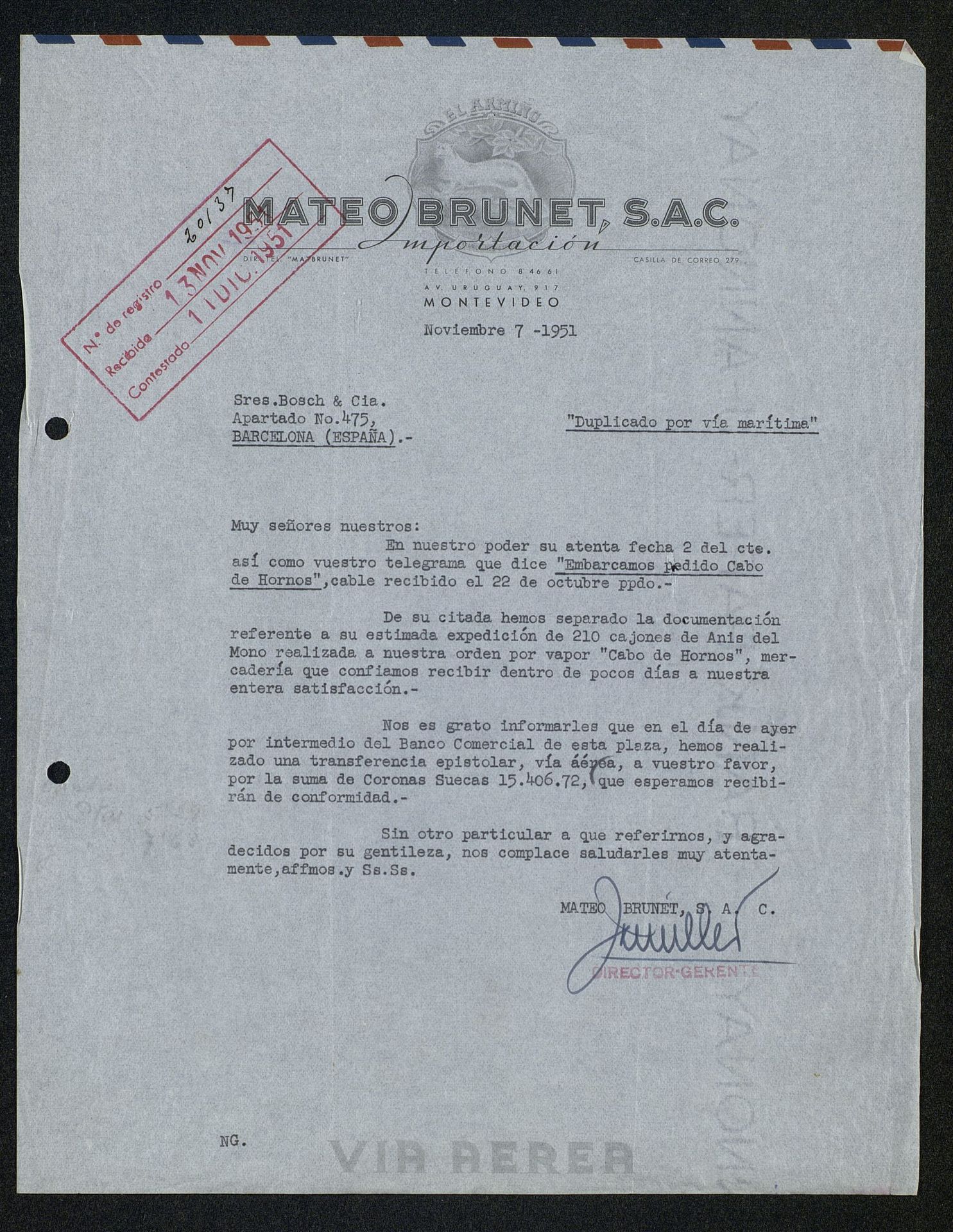 Pedido de Mateo Brunet SAC para el Cabo de Hornos (Chile) donde se habla de 210 cajones de Anís del Mono