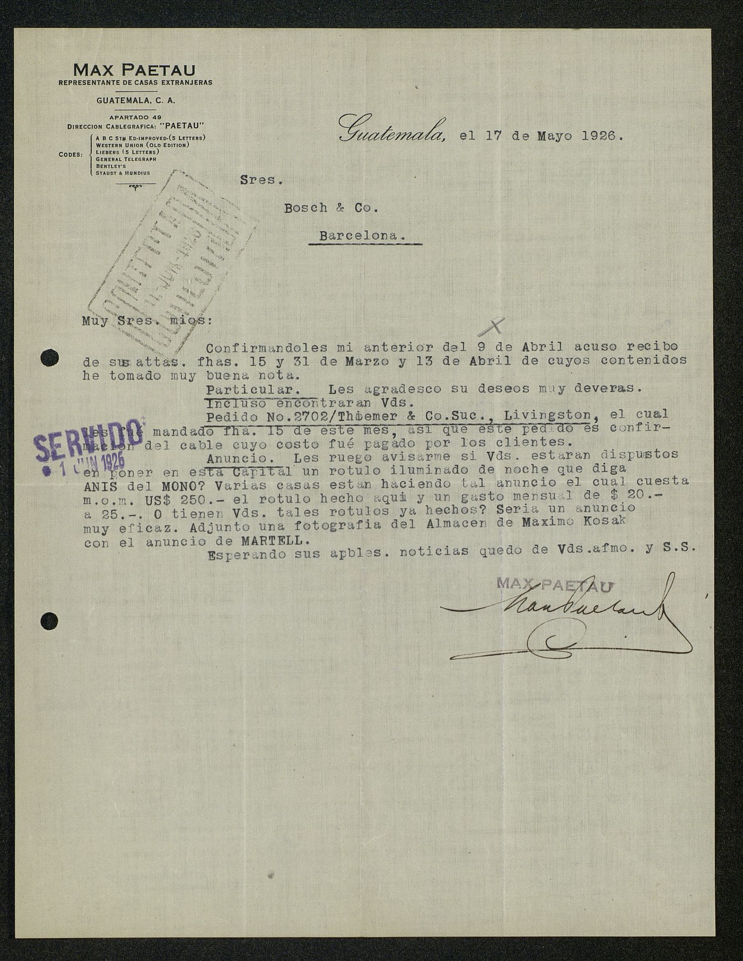 [Carta]1926, de Max Paetau que incluye sugerencia para instalar un luminoso en Guatemala