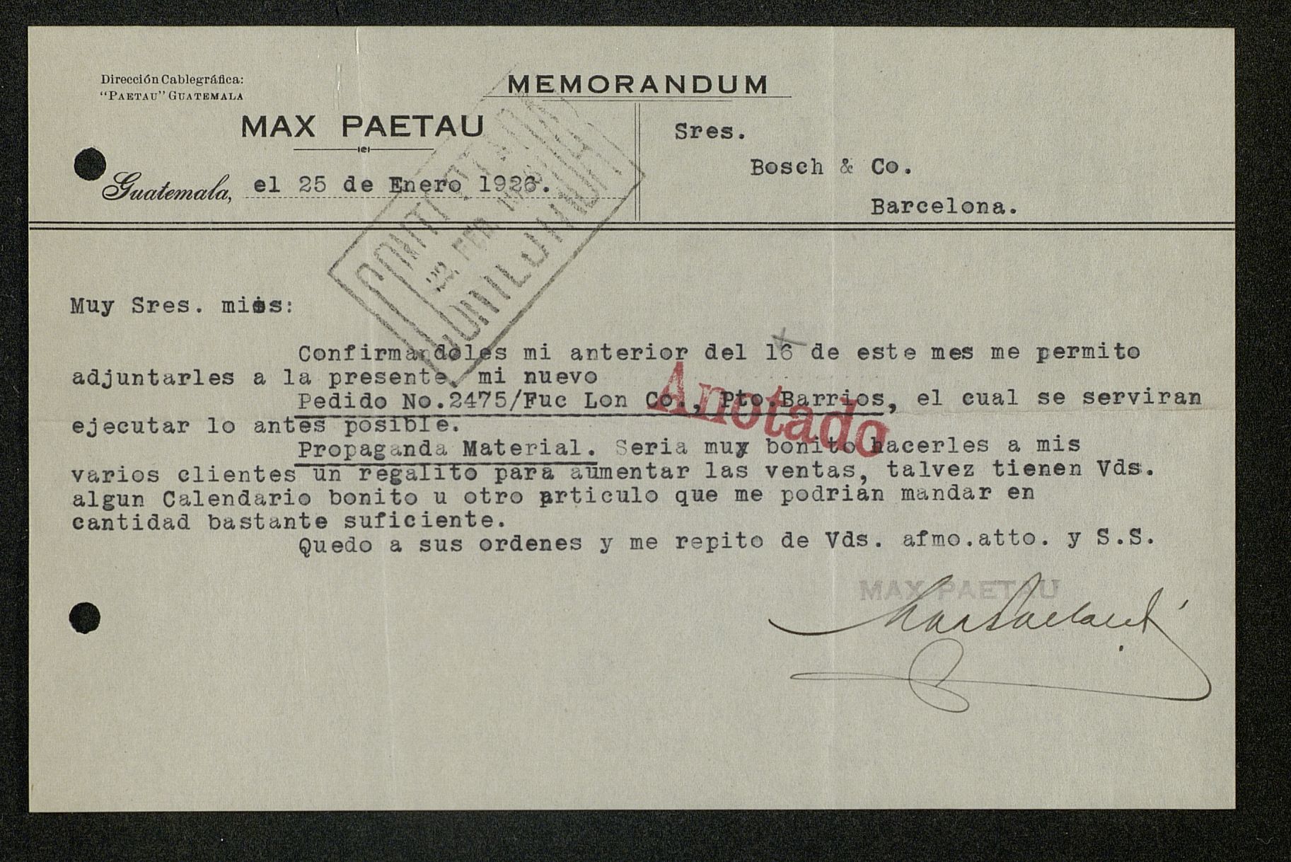Memorandum de Max Paetau que incluye solicitud de calendarios para aumentar las ventas