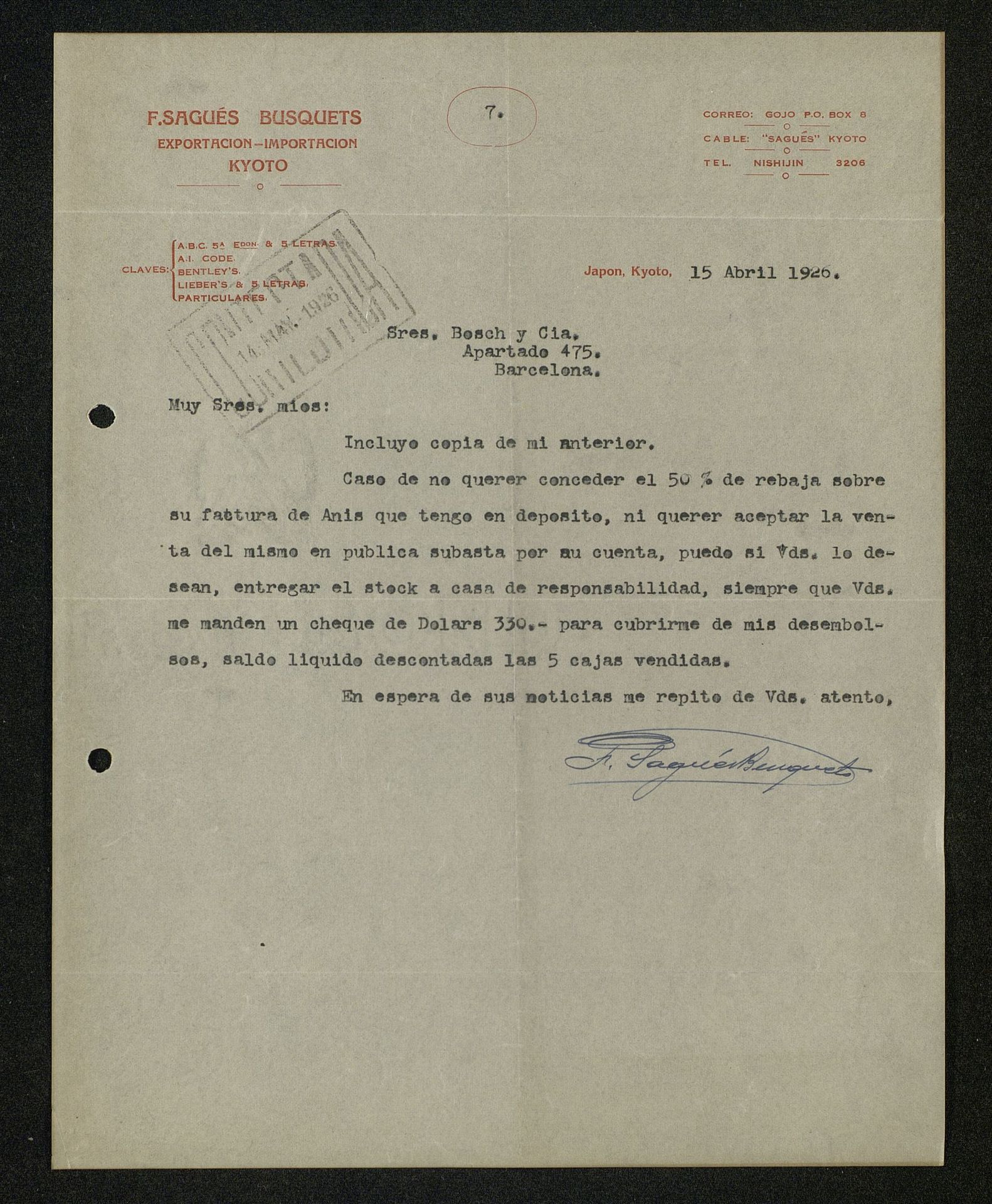 [Carta 2] 1926, de F. Sagués Busquets sobre las dificultades de vender Anís del Mono en Japón