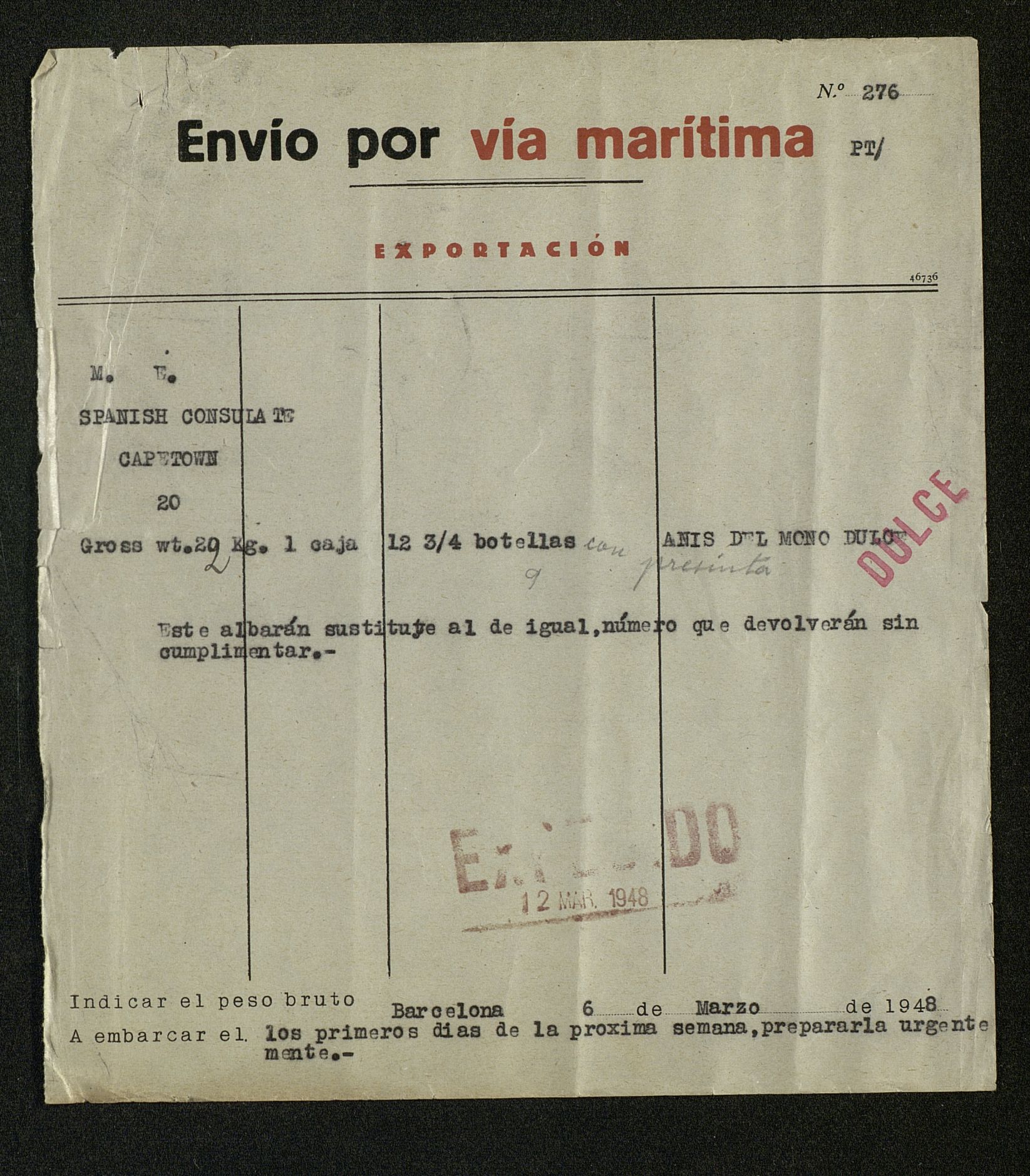 Envío por vía martítima a Capetown (Cuidad del Cabo)