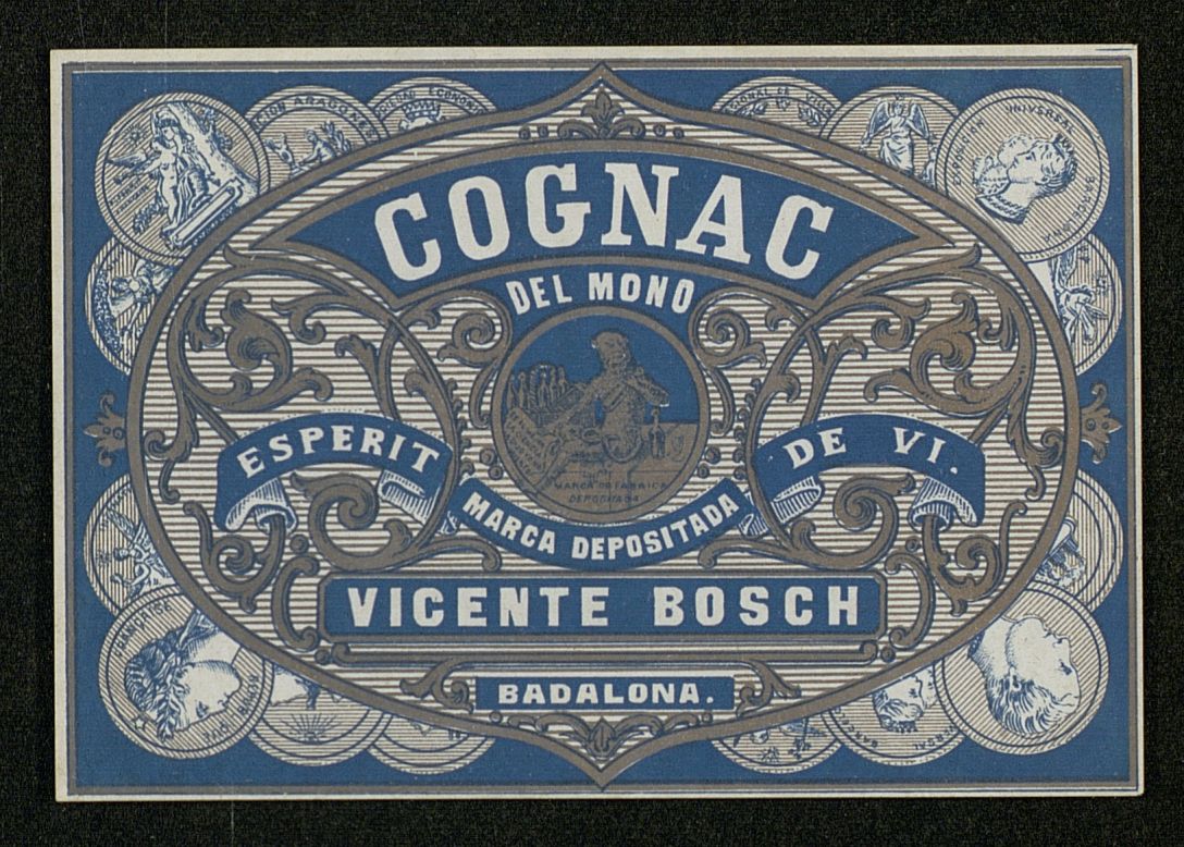 [Etiqueta bebida] Plata y azul cognac del Mono : Vicente Bosch, Badalona (Cataluña, España)