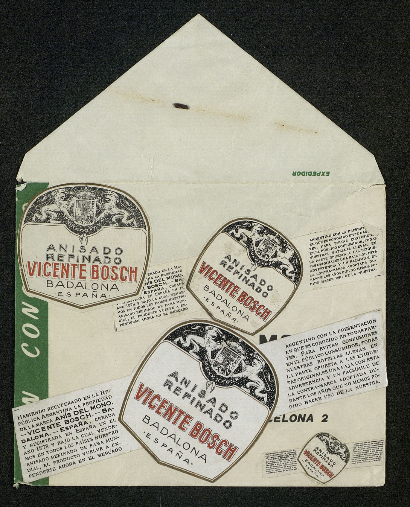 Sobre con etiqueta blanca Anisado refinado. Vicente Bosch. Badalona (Cataluña, España)