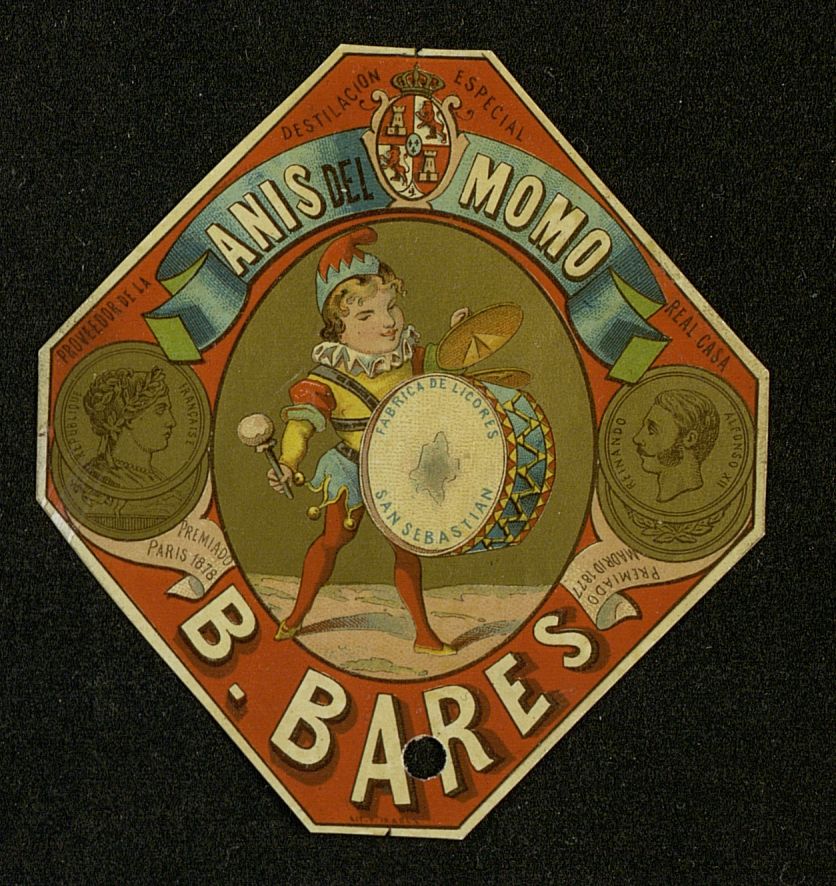 [Etiqueta bebida falsificada] Anisado del Momo, Anís del Momo. B. Bares. San Sebastián (País Vasco, España)
