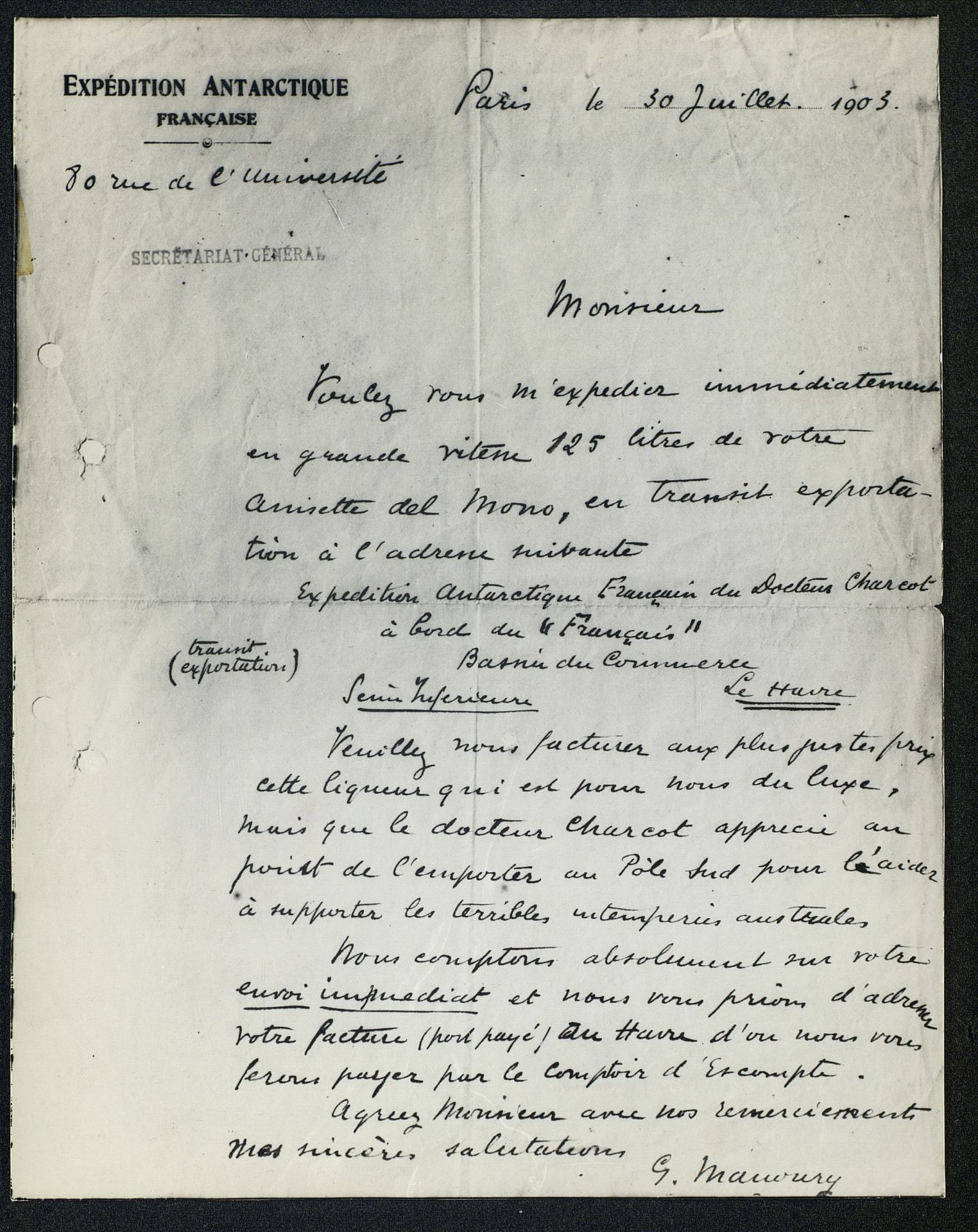 Expédition Antarctique francaise=Carta de la Expedición francesa a la Antartida [Fotografía]
