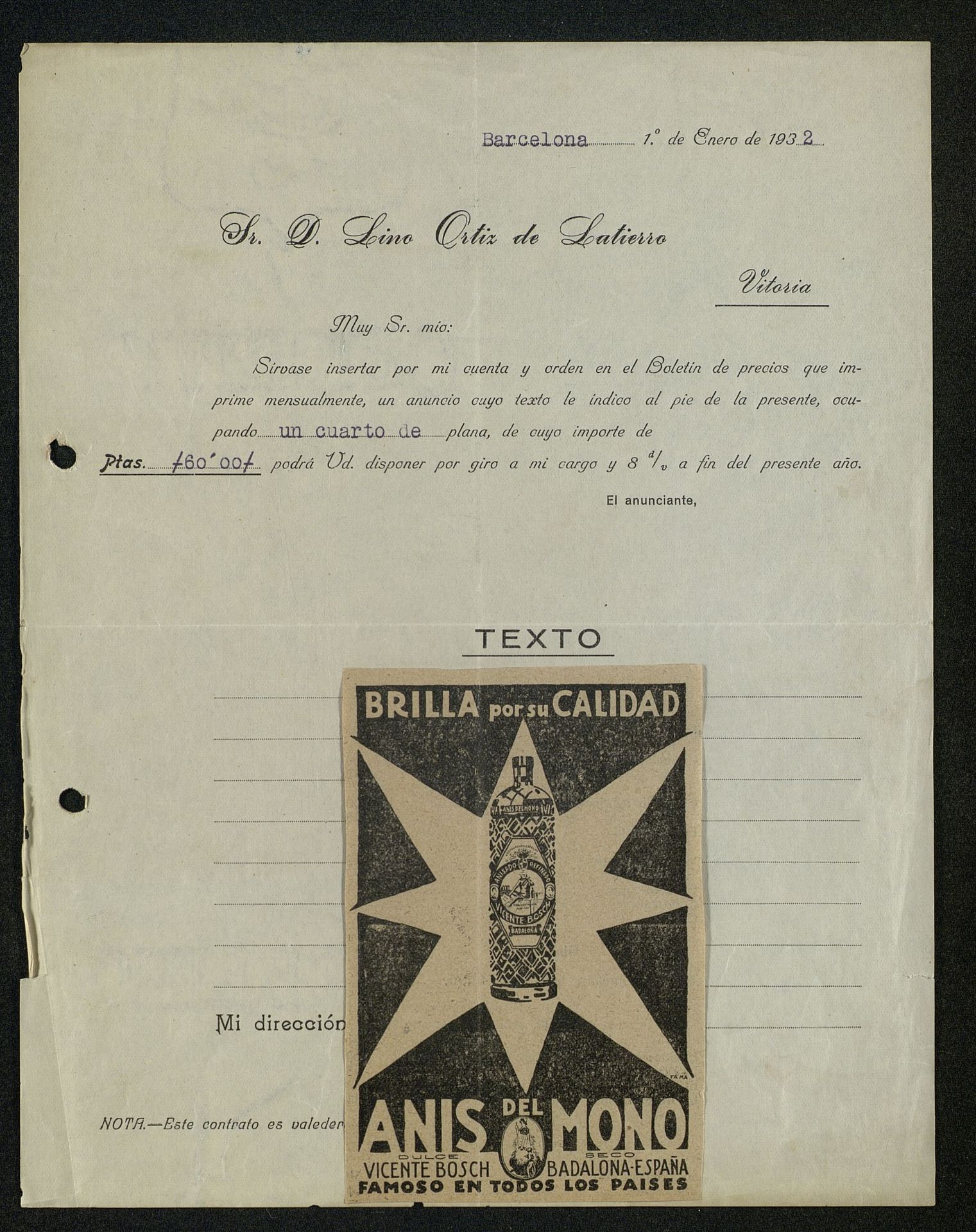 Orden de inserción del anuncio : Anís del Mono Brilla por su Calidad. En el Boletín de Precios