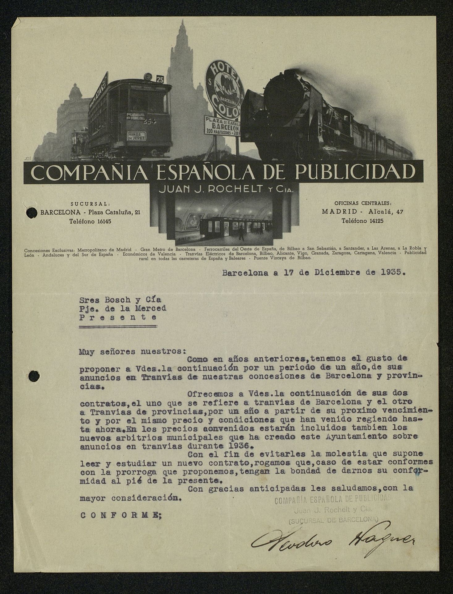Compañía Española de Publicidad Juan J. Rochelt y Compañía sobre la publicidad en tranvías de Barcelona y provincia (Cataluña, España)