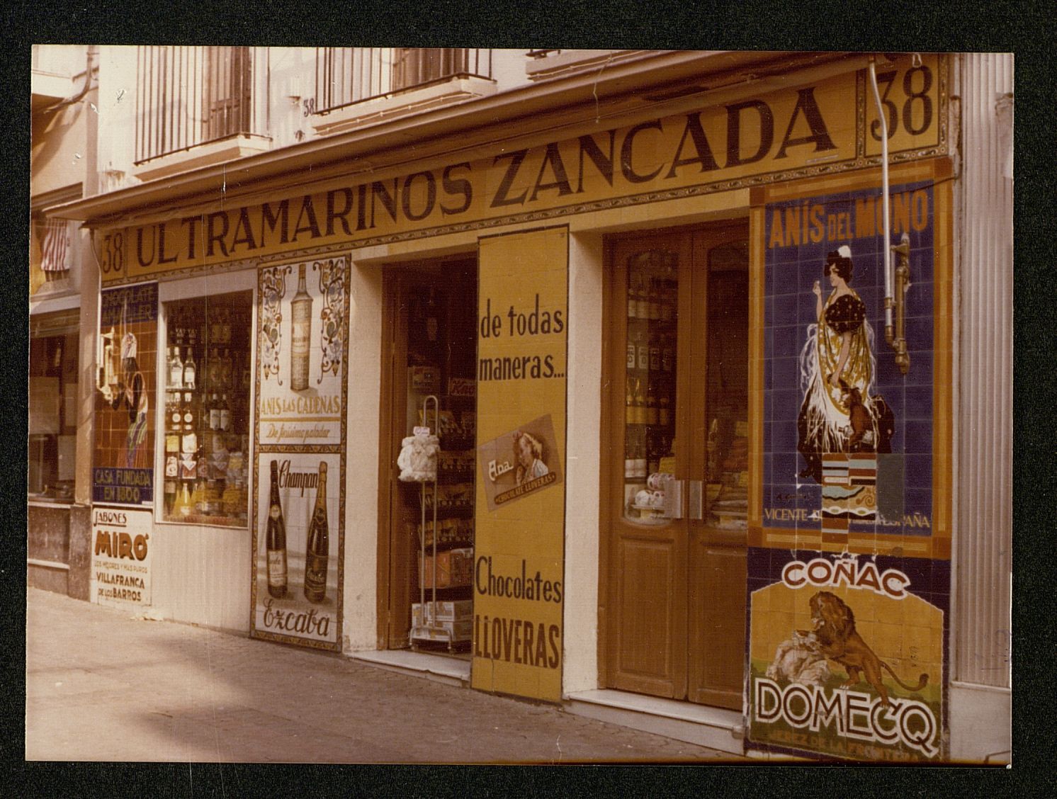 Ultramarinos Zancada con azulejo de Manola Azul de Anís del Mono en fachada [Fotografía]