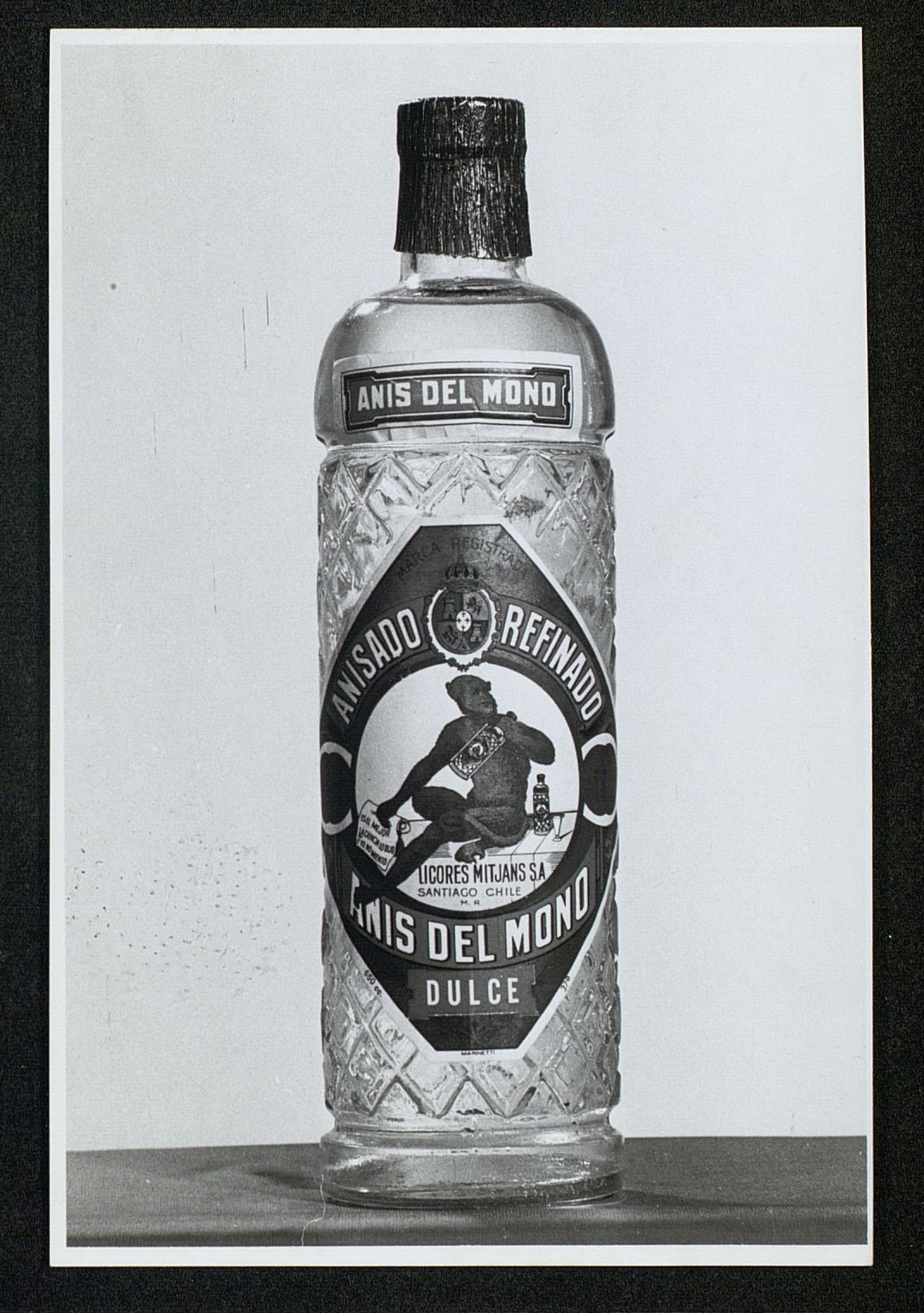 Botella de Anís del Mono Dulce con tapon de corcho y lámina que lo cubre de Licores Mitjans de Santiago de Chile [Fotografía]