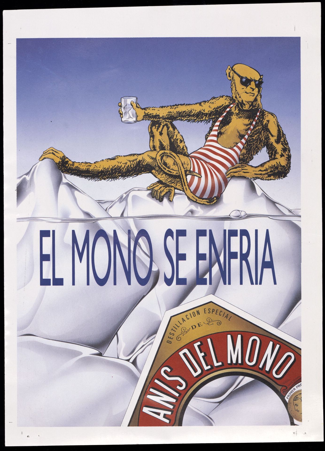 El mono se enfría. Ilustración del Mono con gafas de sol y traje de baño retro de rayas rojas y blancas sobre cubitos de hielo [Cartel 10]