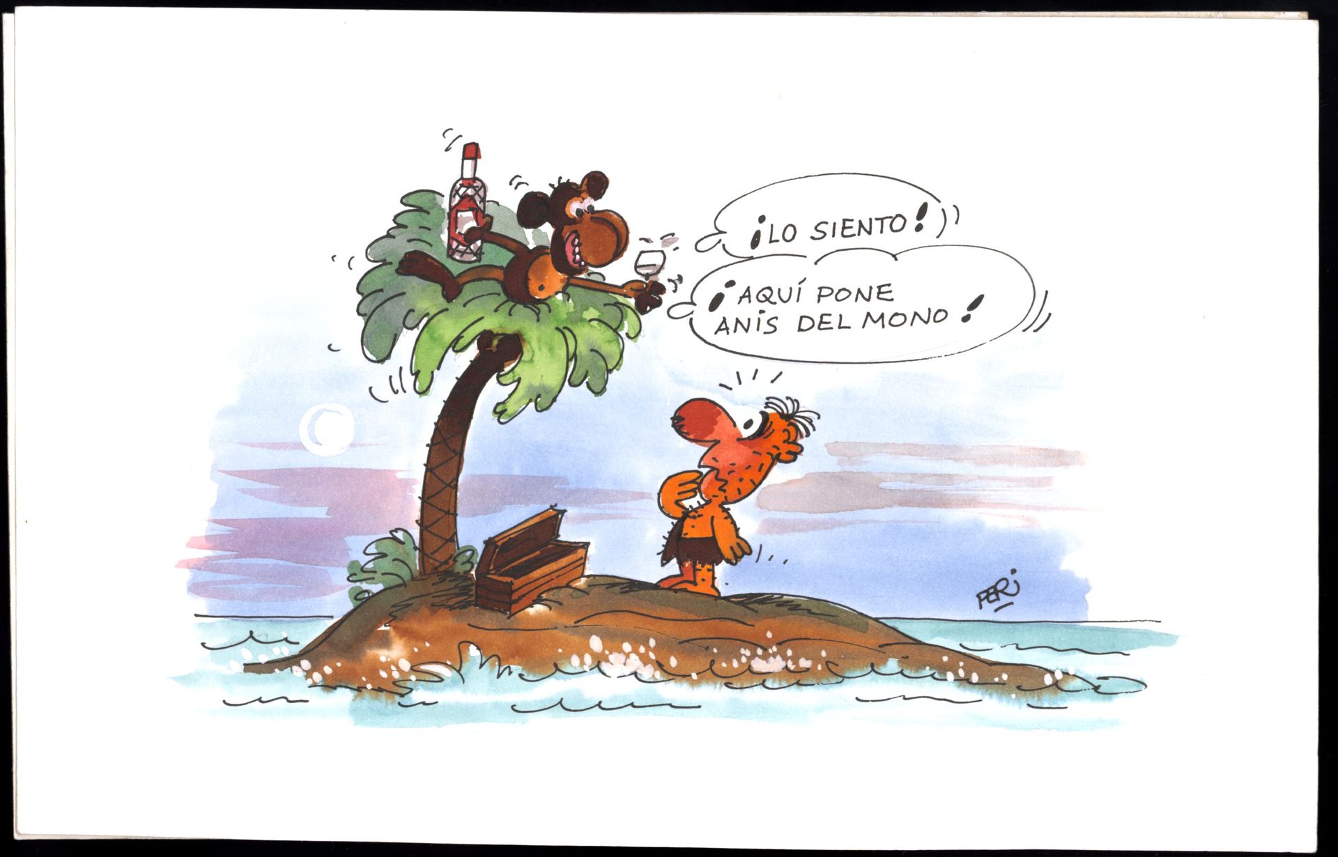 Lo siento. Aquí pone Anís del Mono. Arte final. Viñeta humor del dibujante Peri con imagen de un naúfrago en una isla con mono [Cartel 11]