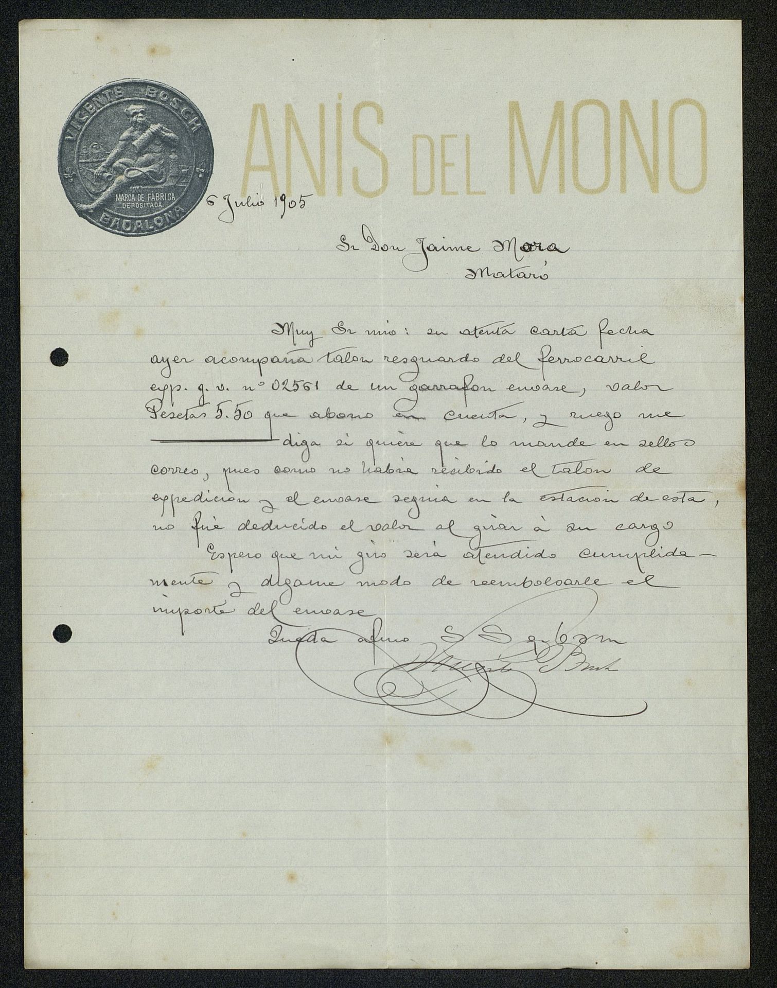 Giro Vicente Bosch a Jaime Mora de Mataró. Detalle marca Anís del Mono en moneda de metal
