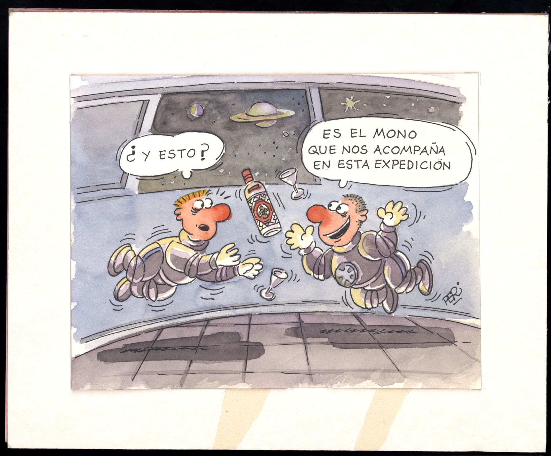 Es el mono que nos acompaña en esta expedición. Arte final. Viñeta humor del dibujante Peri con imagen de dos astronautas [Cartel 12]