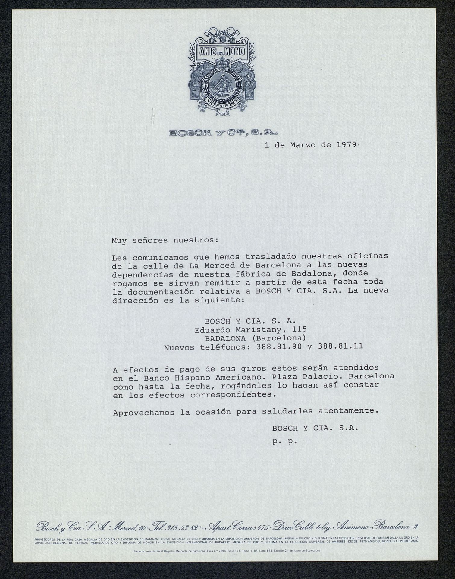 Escrito, 1979, mar. 01, de Bosch y Compañía S.A., anunciando el traslado de las oficinas de la Calle de la Merced en Barcelona a la fábrica de Badalona (Cataluña, España)