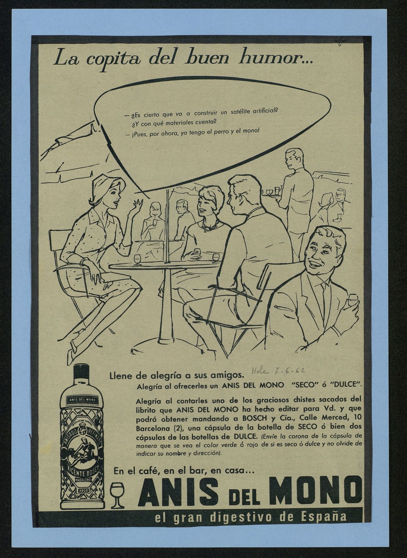 La copita del bueno humor... ¿Es cierto que va a construir un satélite artificial?...Anís del Mono [Anuncio publicitario]