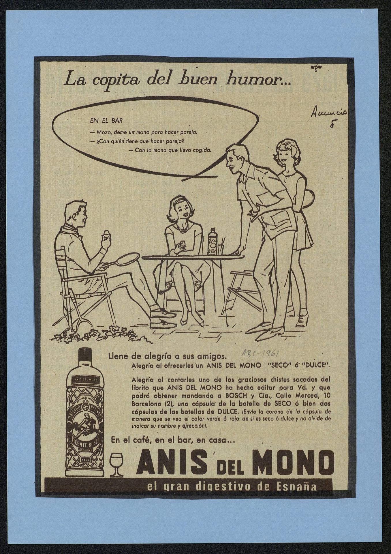 La copita del buen humor. En el Bar : Mozo deme un mono para hacer pareja...[Anuncios publicitarios]