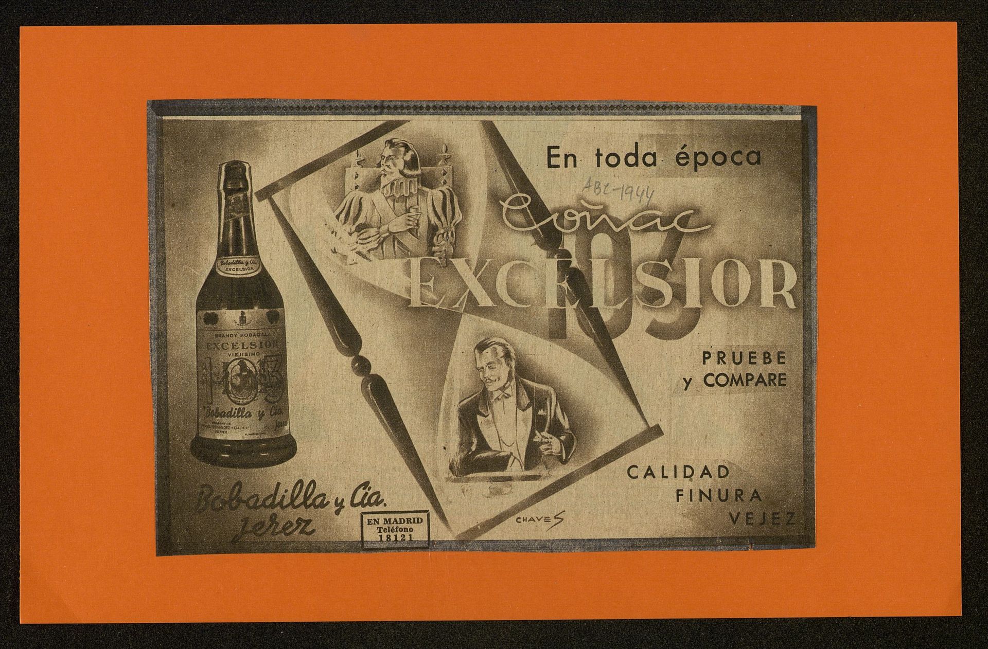 En toda época coñac Excelsior 103, pruebe y compare, calidad, finura y vejez. Dos hombres vestidos de diferentes épocas