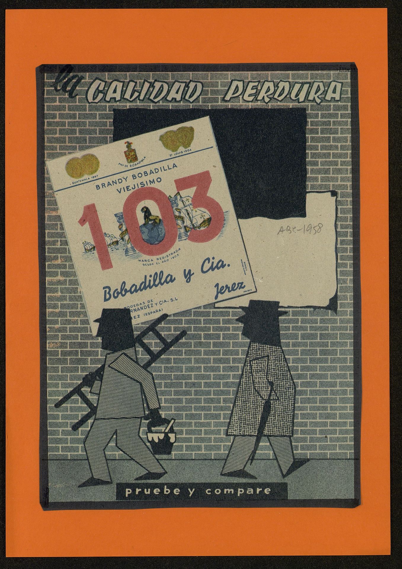 La calidad perdura Brandy Bobadilla Viejísimo 103. Etiqueta de 103, hombre pegando los carteles de 103 y otro hombre le mira