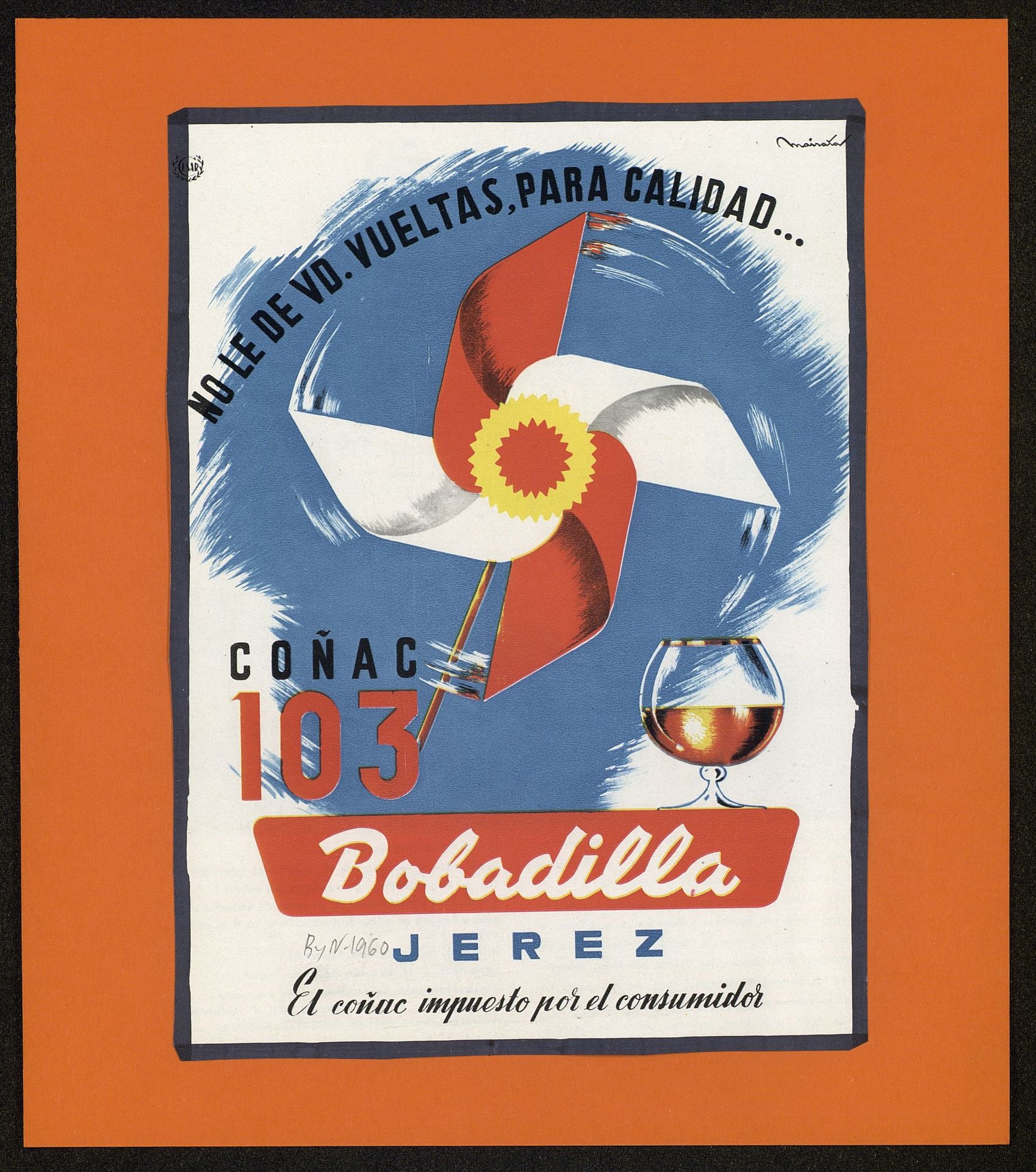 No le de usted vueltas, para la calidad coñac 103 Bobadilla Jerez. El coñac impuesto por el consumidor. Copa de coñac 103 y molino de viento de 4 hojas blancas y rojas