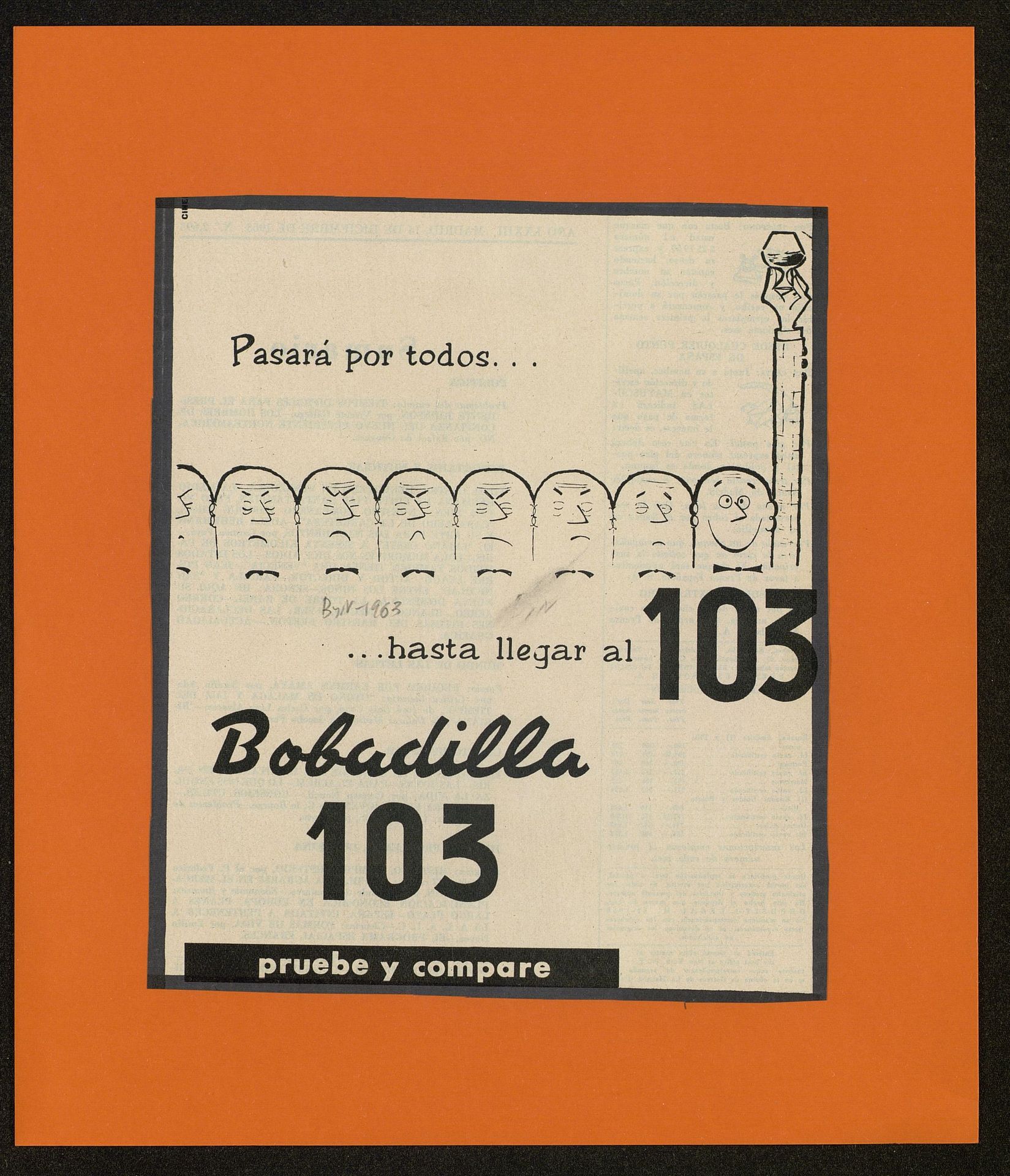 Pasará por todos...Hasta llegar al 103. Bobadilla 103. Dibujo de varias cabezas de hombres y el último con la mano levantada con la copa de 103 Bobadilla