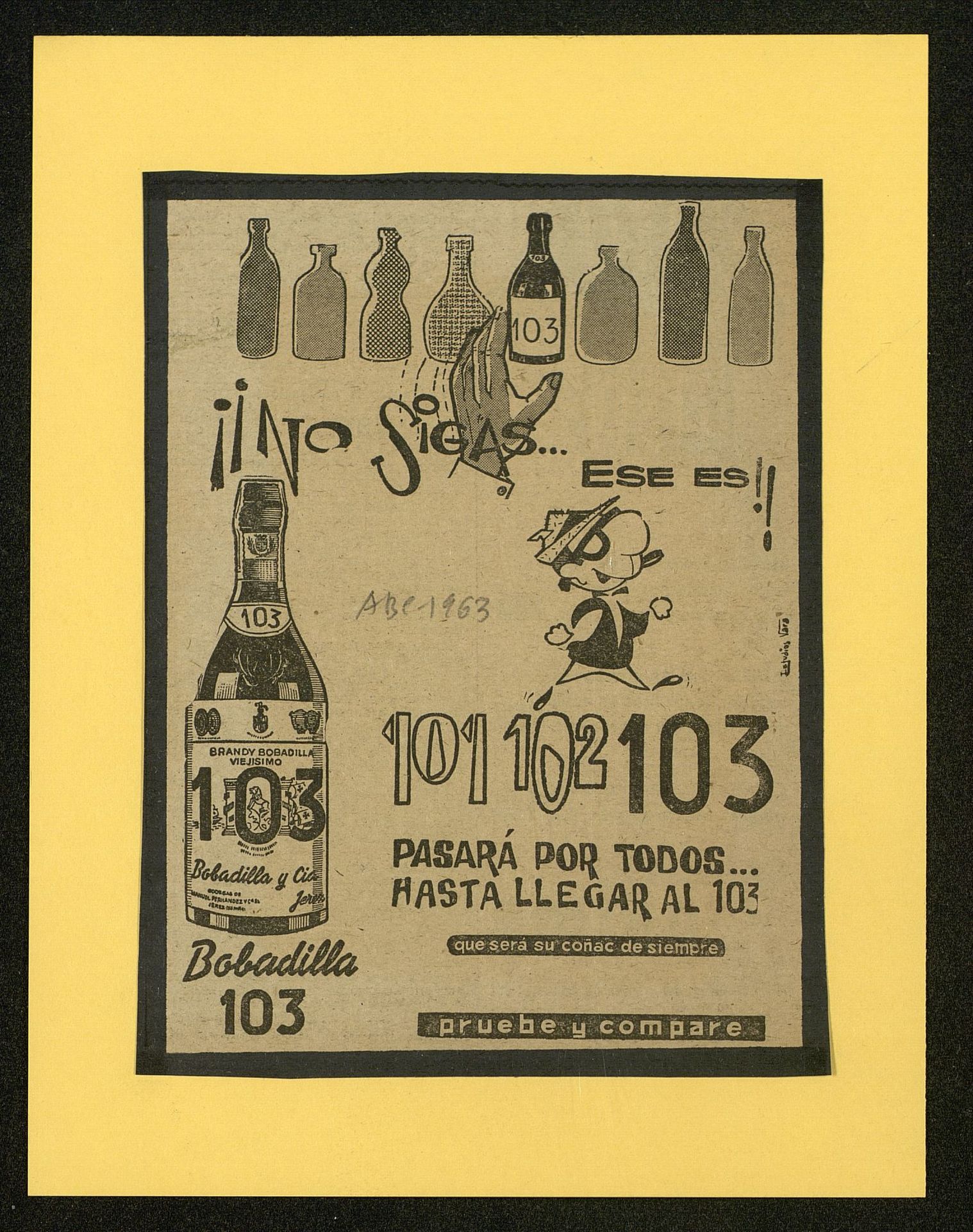 No sigas...ese es101,102,103..pasará por todos...Hasta llegar al 103 que será su coñac de siempre. Dibujo de varias botellas y un señor andando por los números 101,102