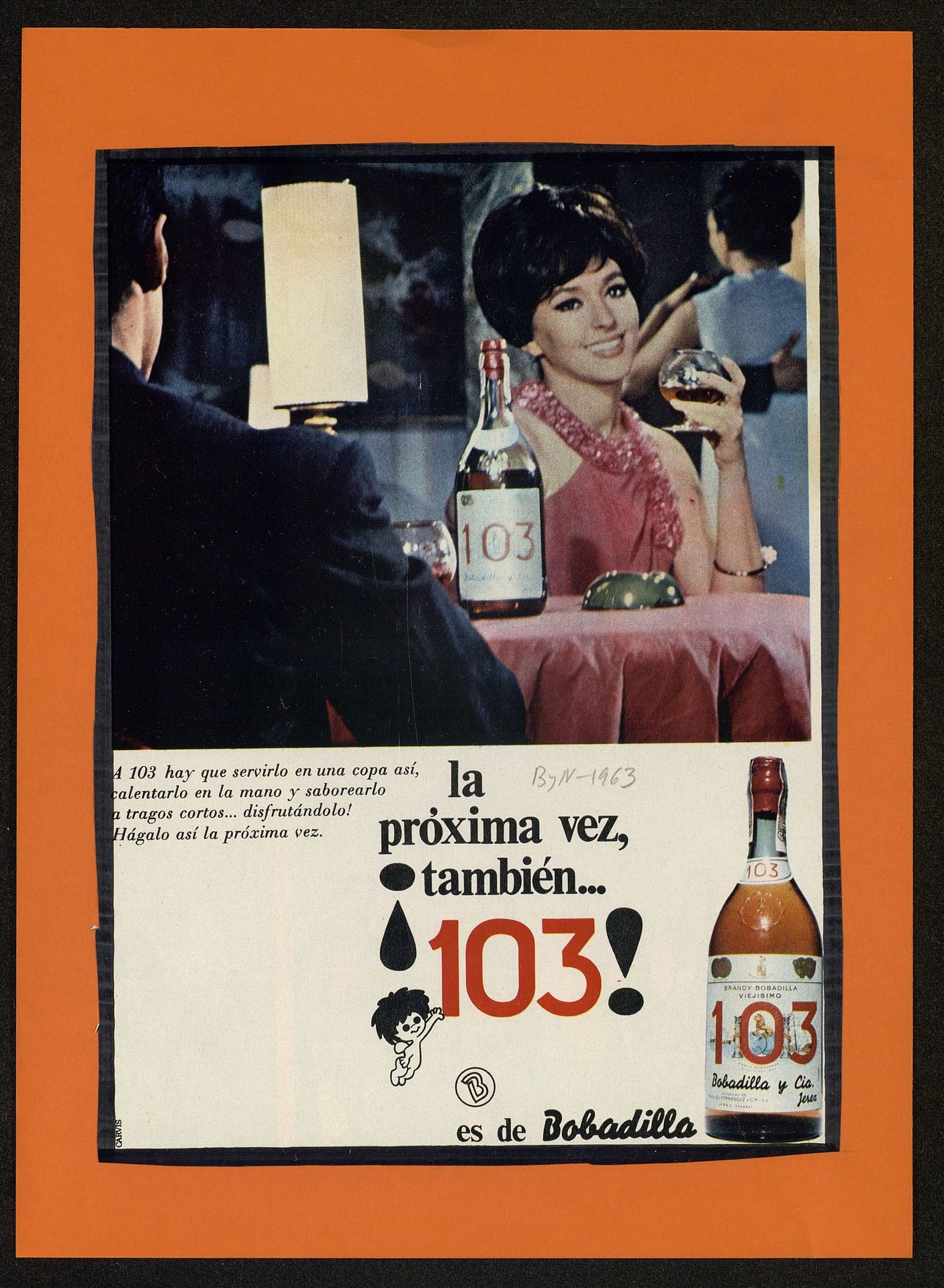 A 103 hay que servirlo en una copa así, calentarlo en la mano y saborearlo a tragos cortos...disfrutándolo Pareja sentada con botella de 103Bobadilla y copa en la mano