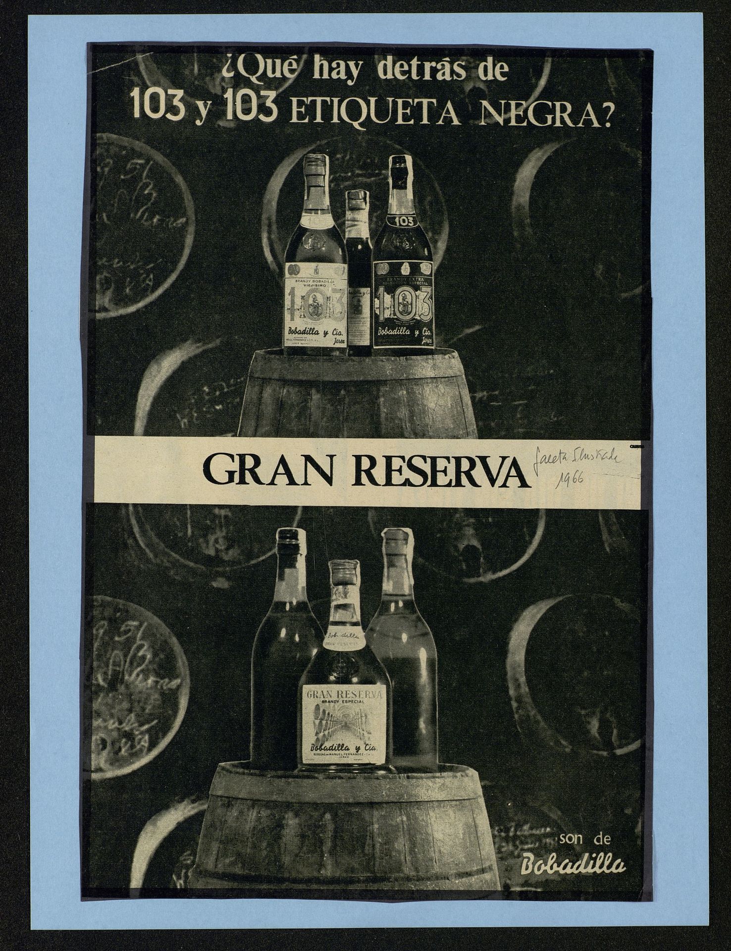 Qué hay detrás de103 y 103 etiqueta negra Gran reserva, son de Bobadilla. Botellas de Gran reserva, 103 y 103 Etiqueta negra en una bodega sobre barriles