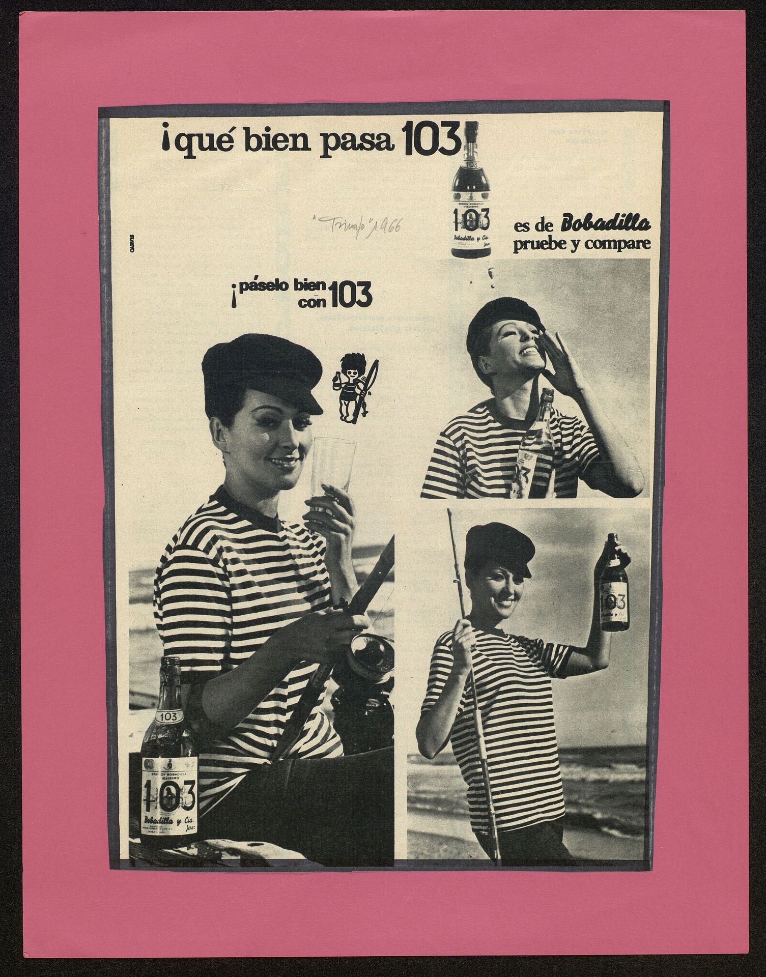 Qué bien pasa 103 es de Bobadilla, pruebe y compare páselo bien con 103. Chica con camiseta de rayas, botella de 103 en la playa pescando