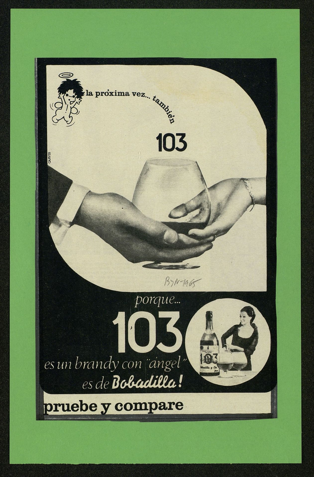 La próxima vez...también 103 porque 103 es un brandy con ángel es de Bobadilla Manos sujetando una copa. Dibujo del ángel