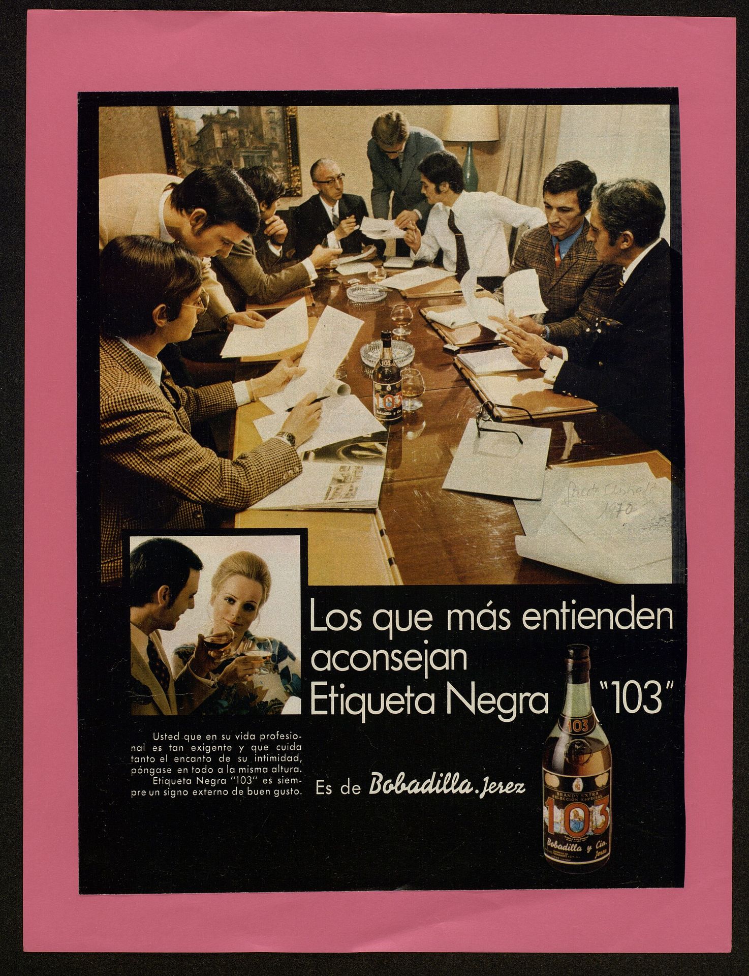 Usted que en su vida profesional es tan exigente y que cuida tanto el encanto de su intimidad...Los que más entienden aconsejan Etiqueta Negra 103. Reunión de ejecutivos con botella de103