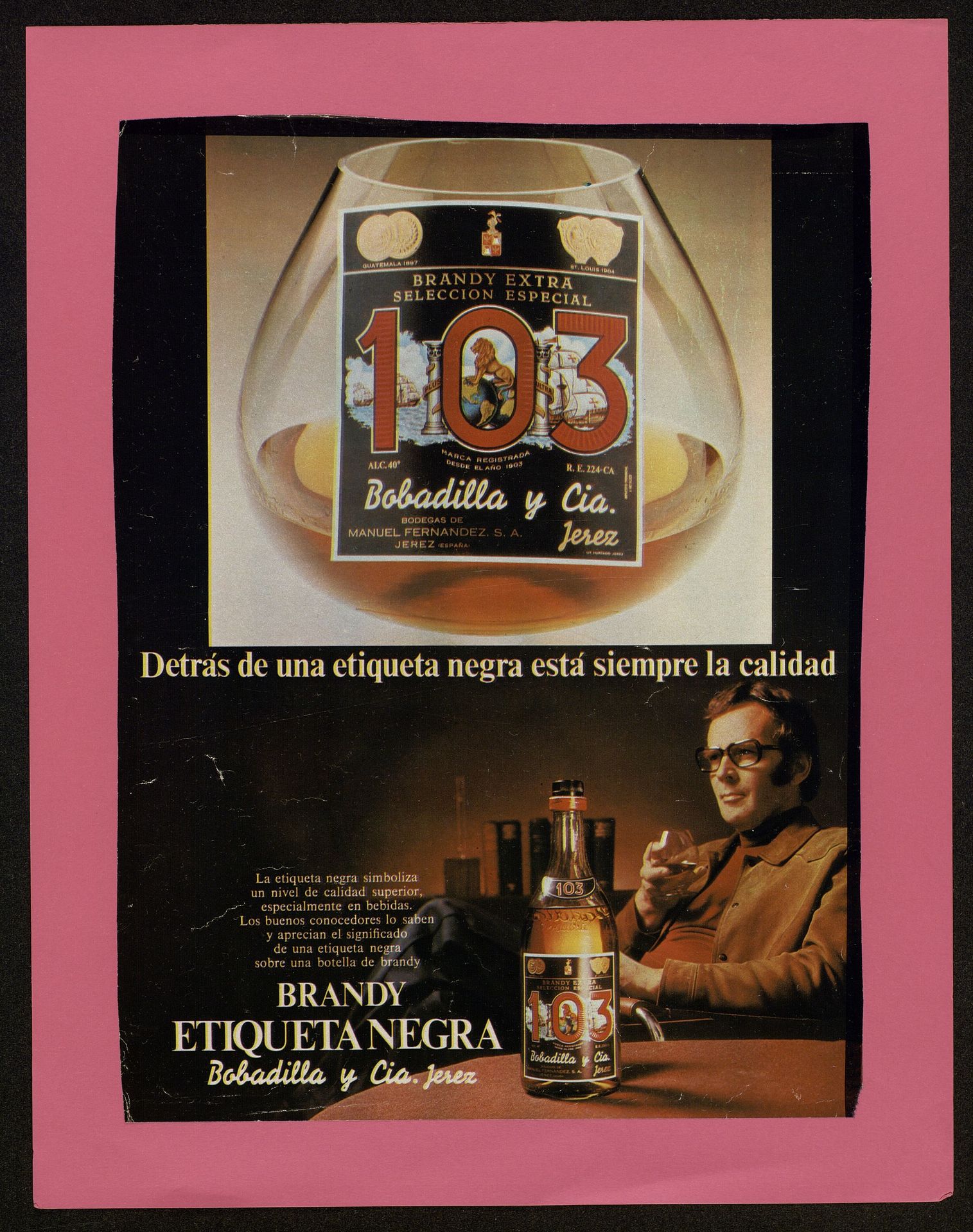 Detrás de una etiqueta negra está siempre la calidad. La etiqueta negra simboliza un nivel de calidad superior. Hombre con copa y botella de 103 Etiqueta Negra