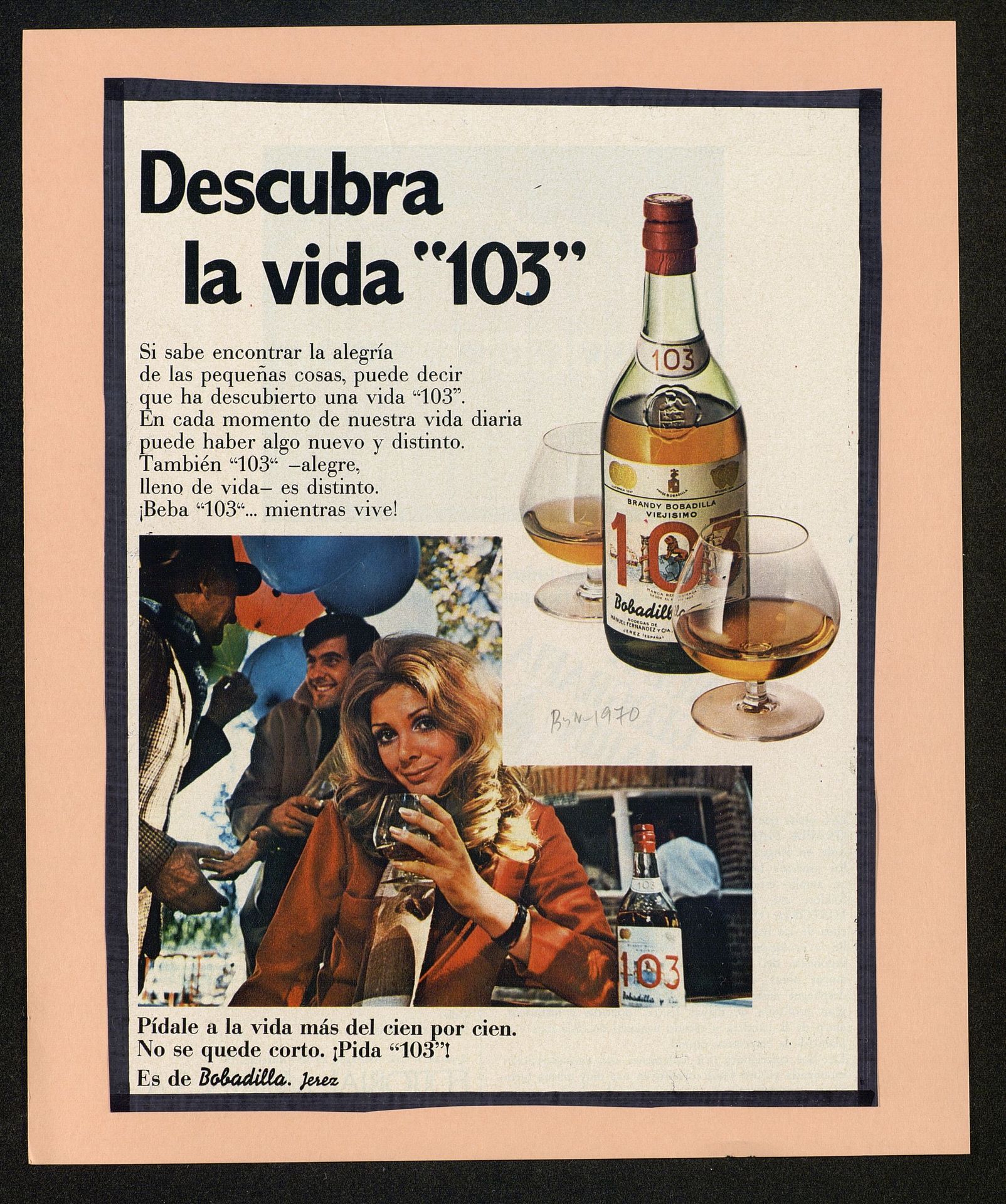 Descubra la vida 103. Si sabe encontrar la alegría de laspequeñas cosas, puede decir que ha descubierto una vida 103. Chica con copa y botella de 103