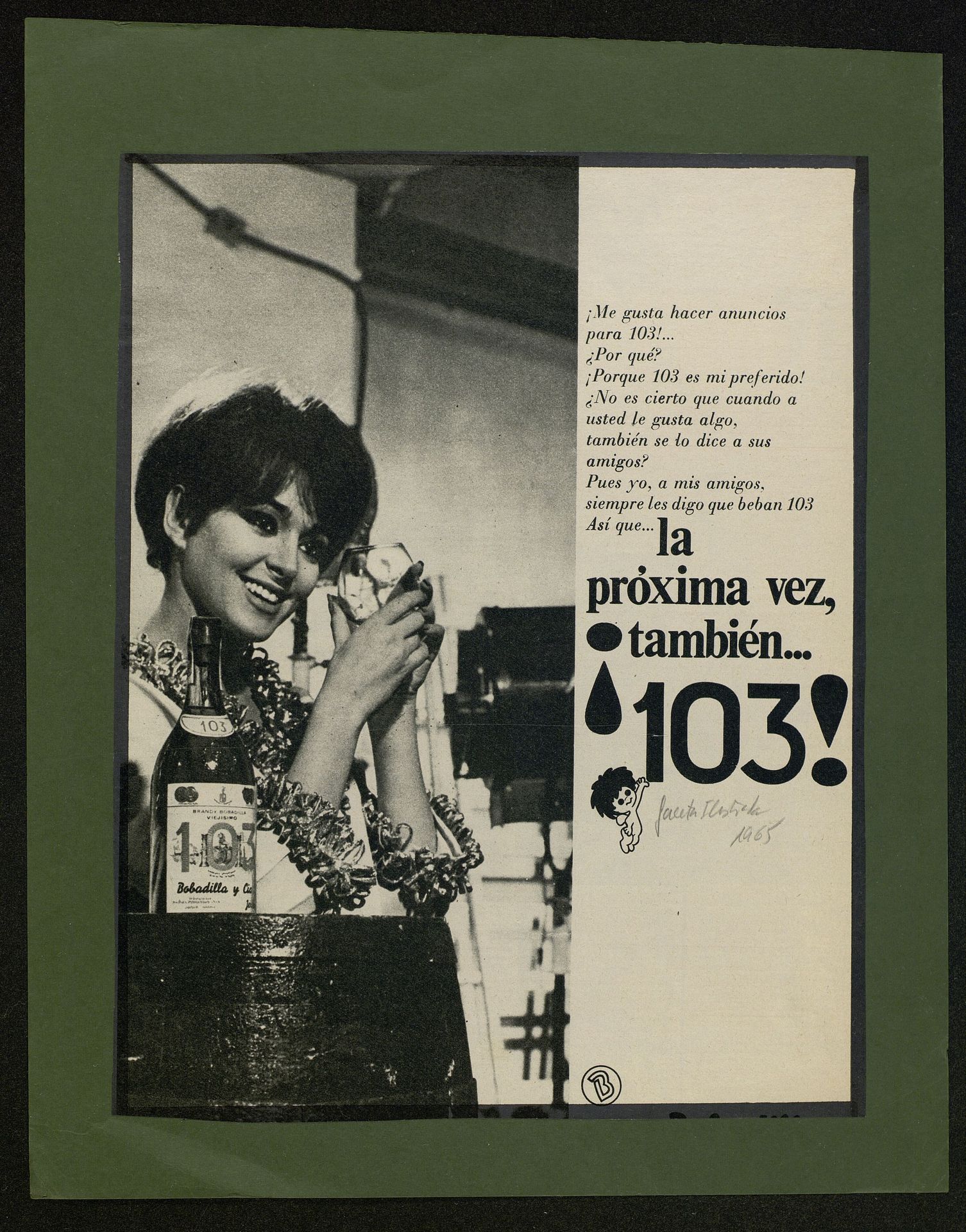 Me gusta hacer anuncios para 103Porque 103 es mi preferido...la próxima vez, también..103Chica en una bodega con copa y botella 103 Bobadilla