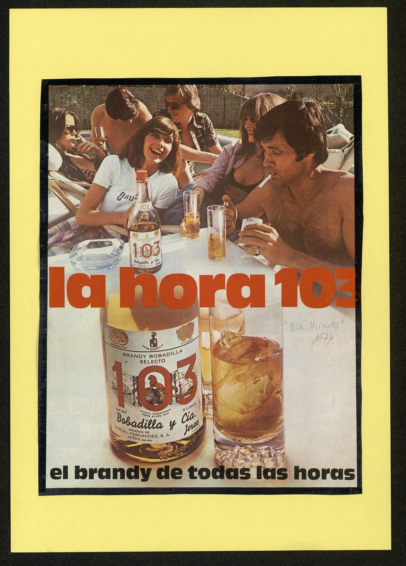 La hora 103. El brandy de todas las horas. Grupo de amigos en una piscina con botella de 103 Bobadilla y vasos con brandy