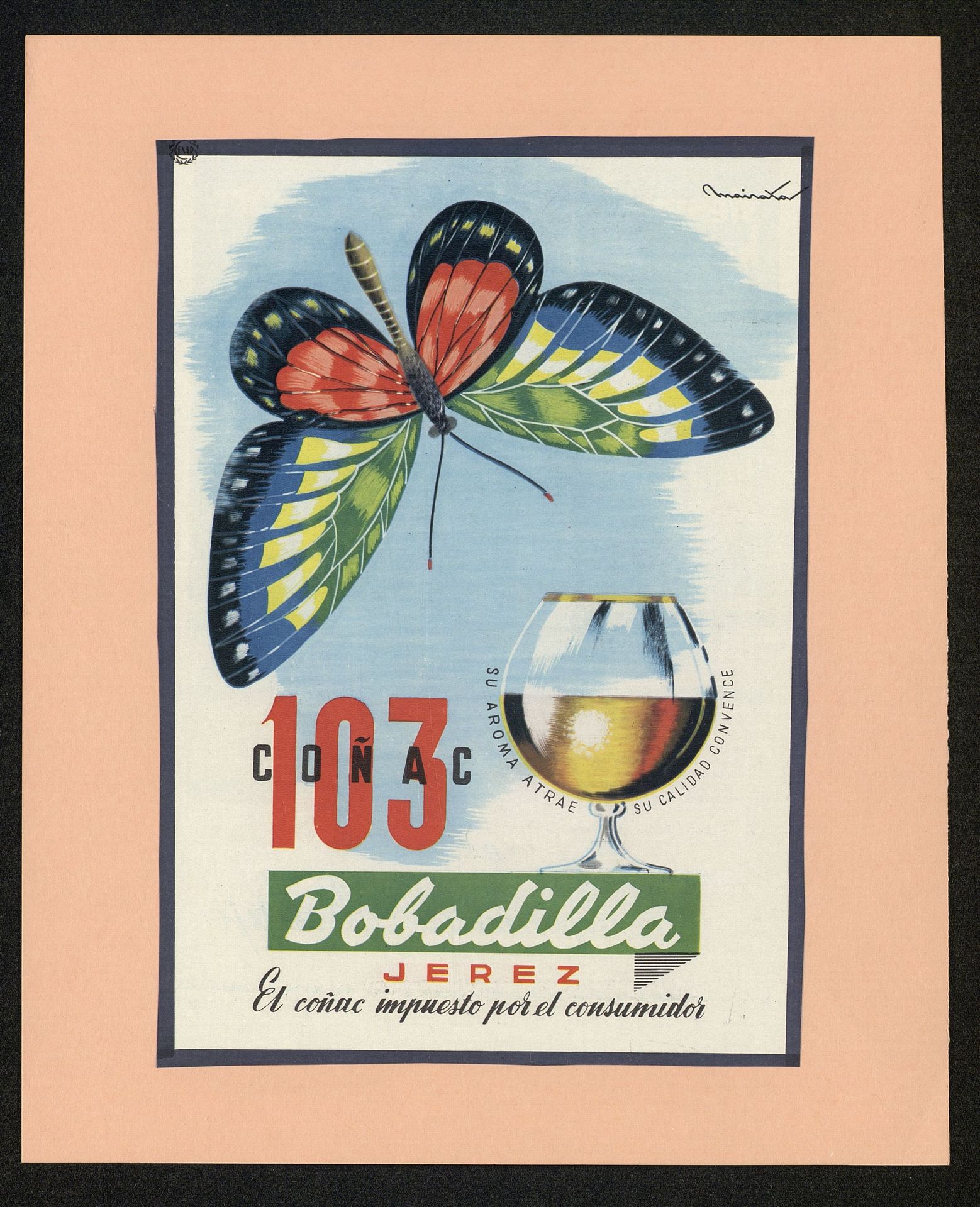 Su aroma atrae, su calidad convence. Coñac 103 Bobadilla. El coñac impuesto por el consumidor. Imagen de una copa y una mariposa