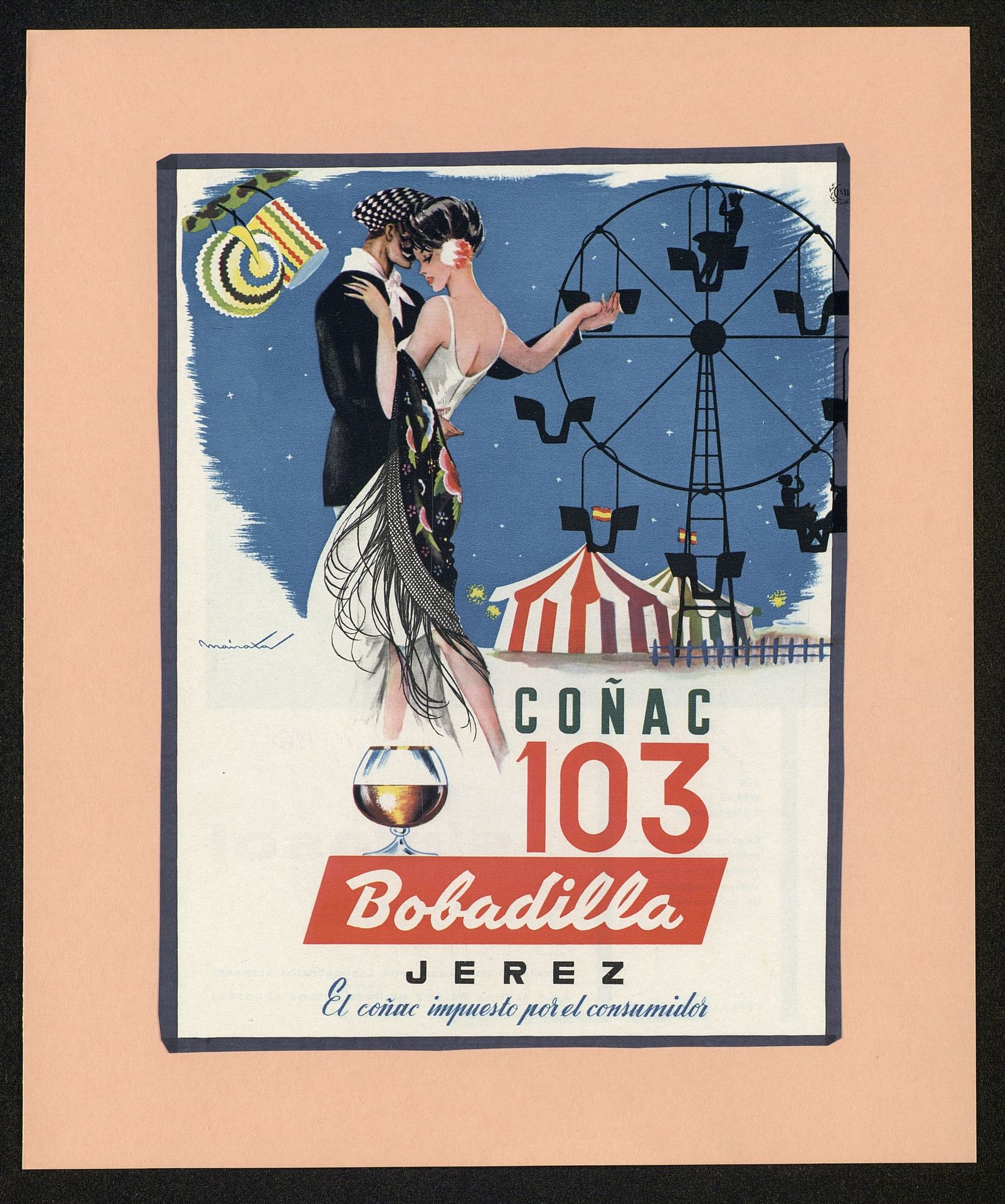 El coñac impuesto por el consumidor. Coñac 103 Bobadilla. Dibujo de la feria y pareja bailando