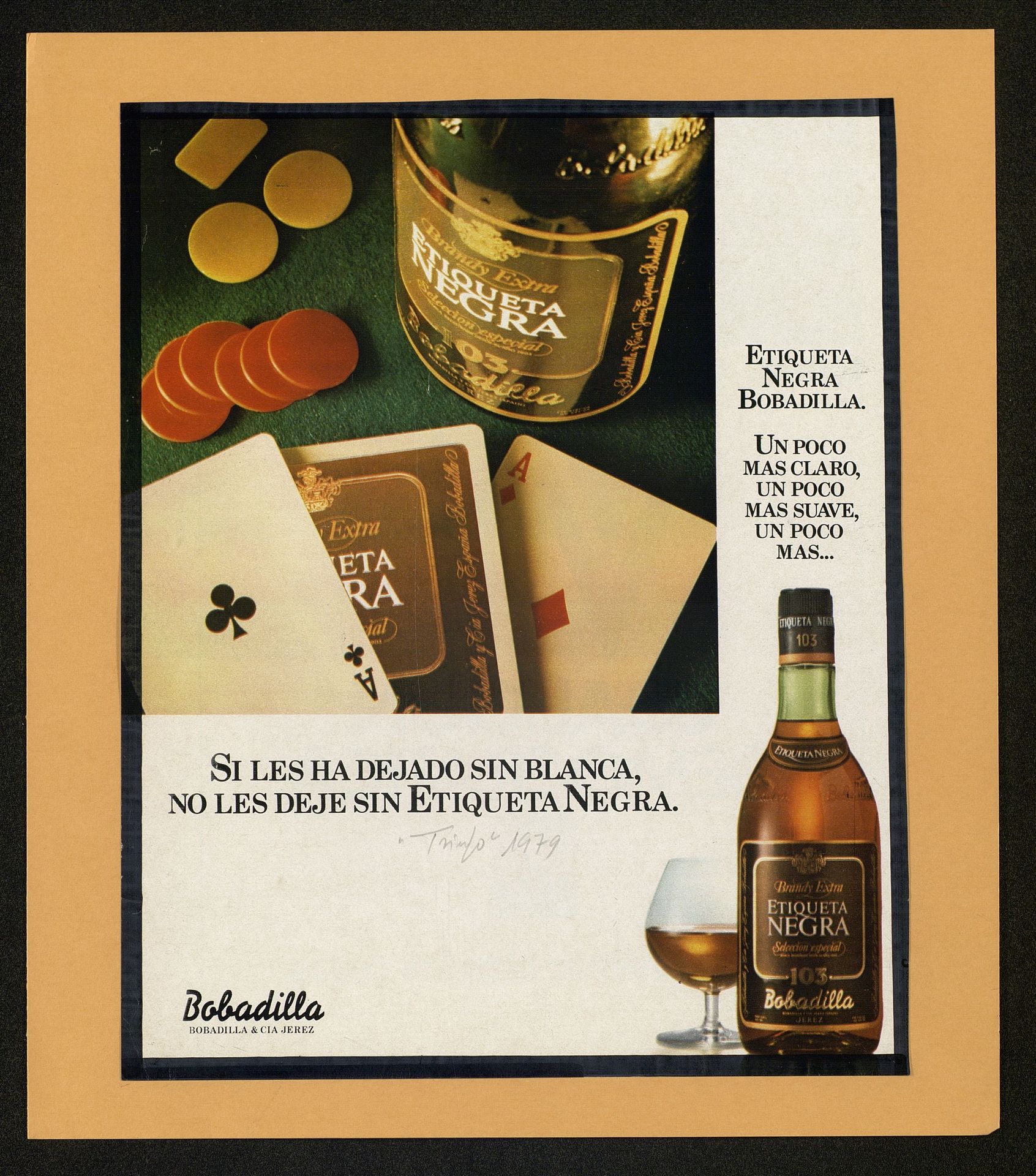 Si les ha dejado sin blanca, no les deje sin Etiqueta Negra. Botella de brandy etiqueta negra y varios naipes y fichas