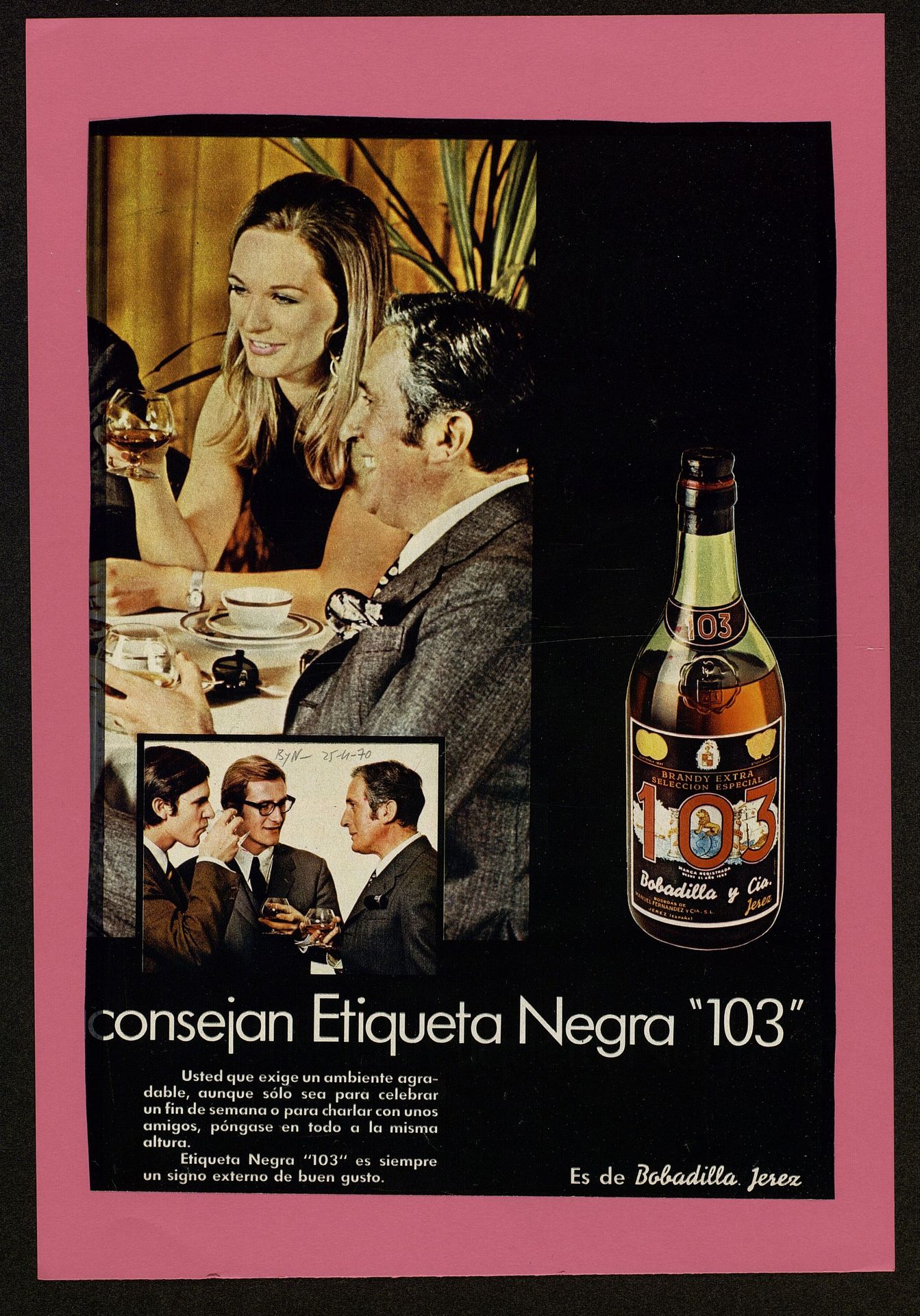 Los que más entienden aconsejan Etiqueta Negra 103 es siempre un signo de buen gusto. Reunión de amigos en una mesa redonda, compartiendo Brandy Selección Especial 104