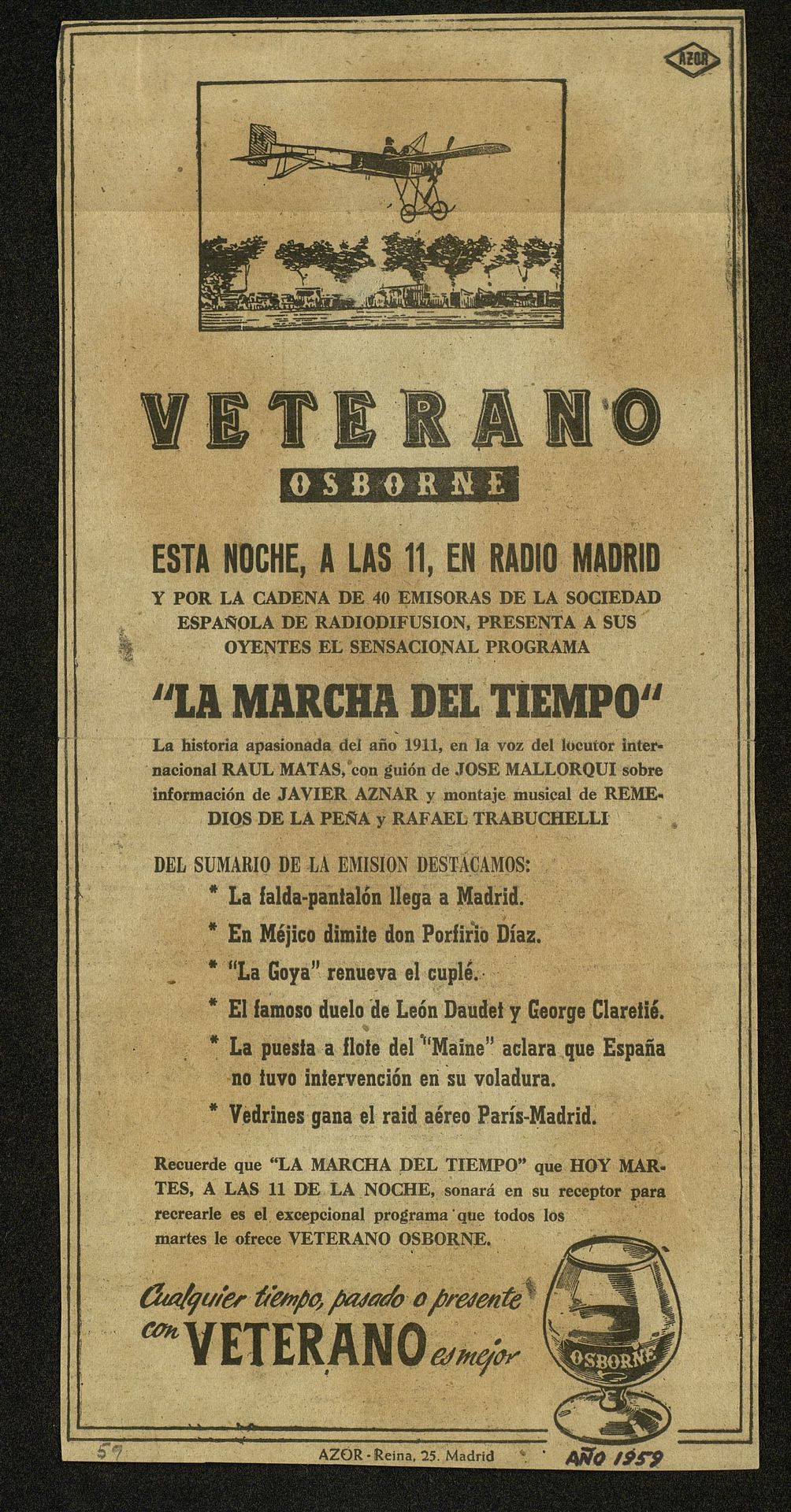 Veterano Osborne. La Marcha del tiempo, le hará revivir la historia desde 1911 en 40 emisoras de SER Radio desde Radio Madrid Guión de Rafael Mallorquí, música Rafael Trabuchelli, locutor Raúl Matas. 3 Programa, todos los martes a las 11 de la noche