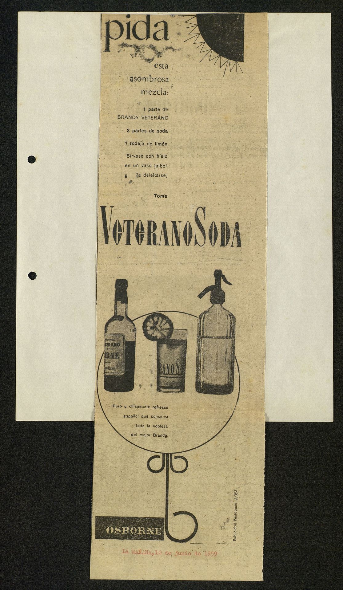 Pida esta asombrosa mezcla. VeteranoSoda, Puro y chispeante refresco español que conserva toda la nobleza del mejor brandy. Comando Osborne