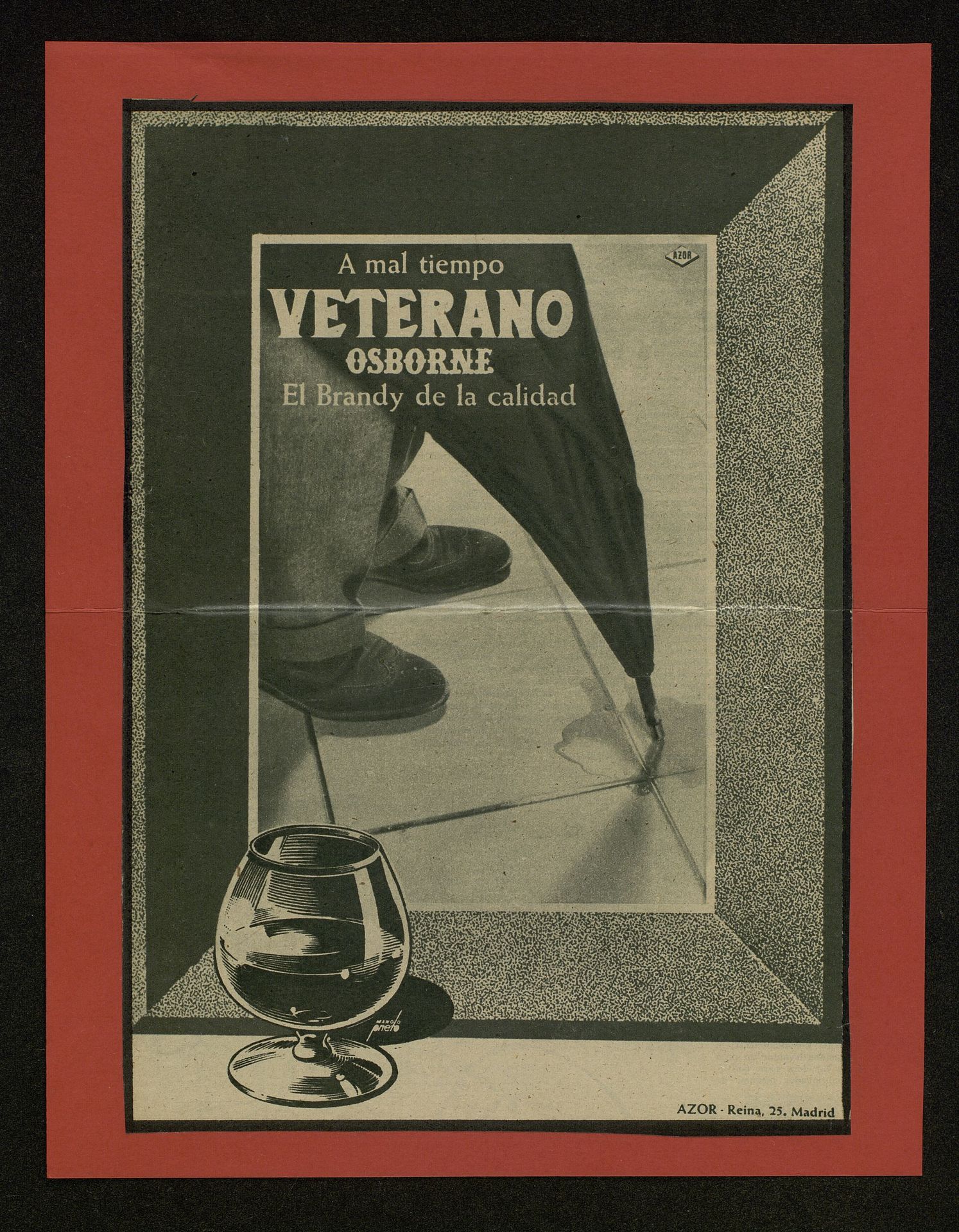 Al mal tiempo VETERANO Osborne, El brandy de calidad. Paraguas cerrado y zapatos de hombre