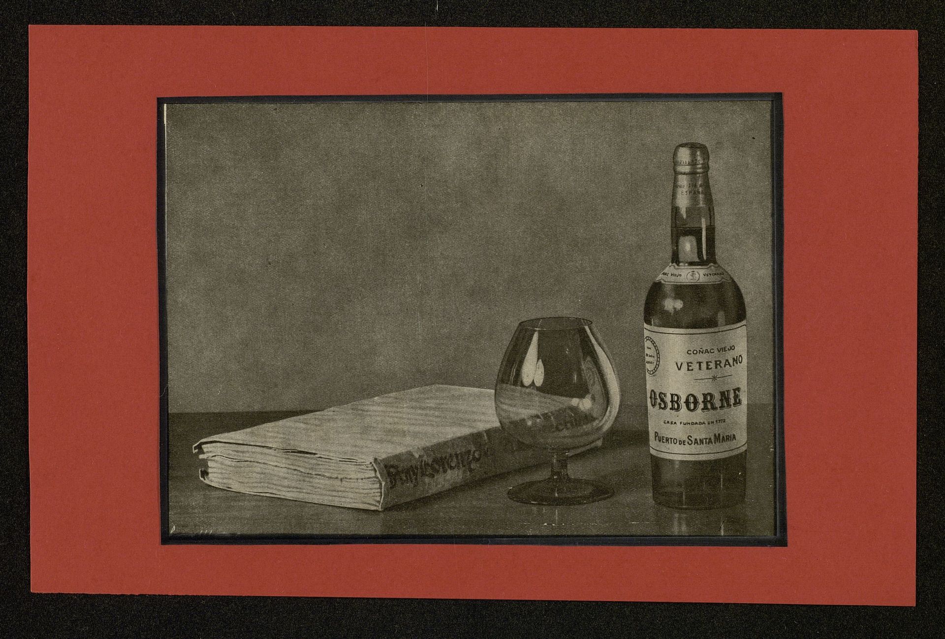 Coñac viejo Veterano Osborne. Botella Veterano, copa y libro