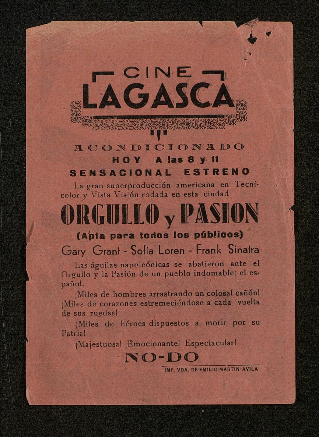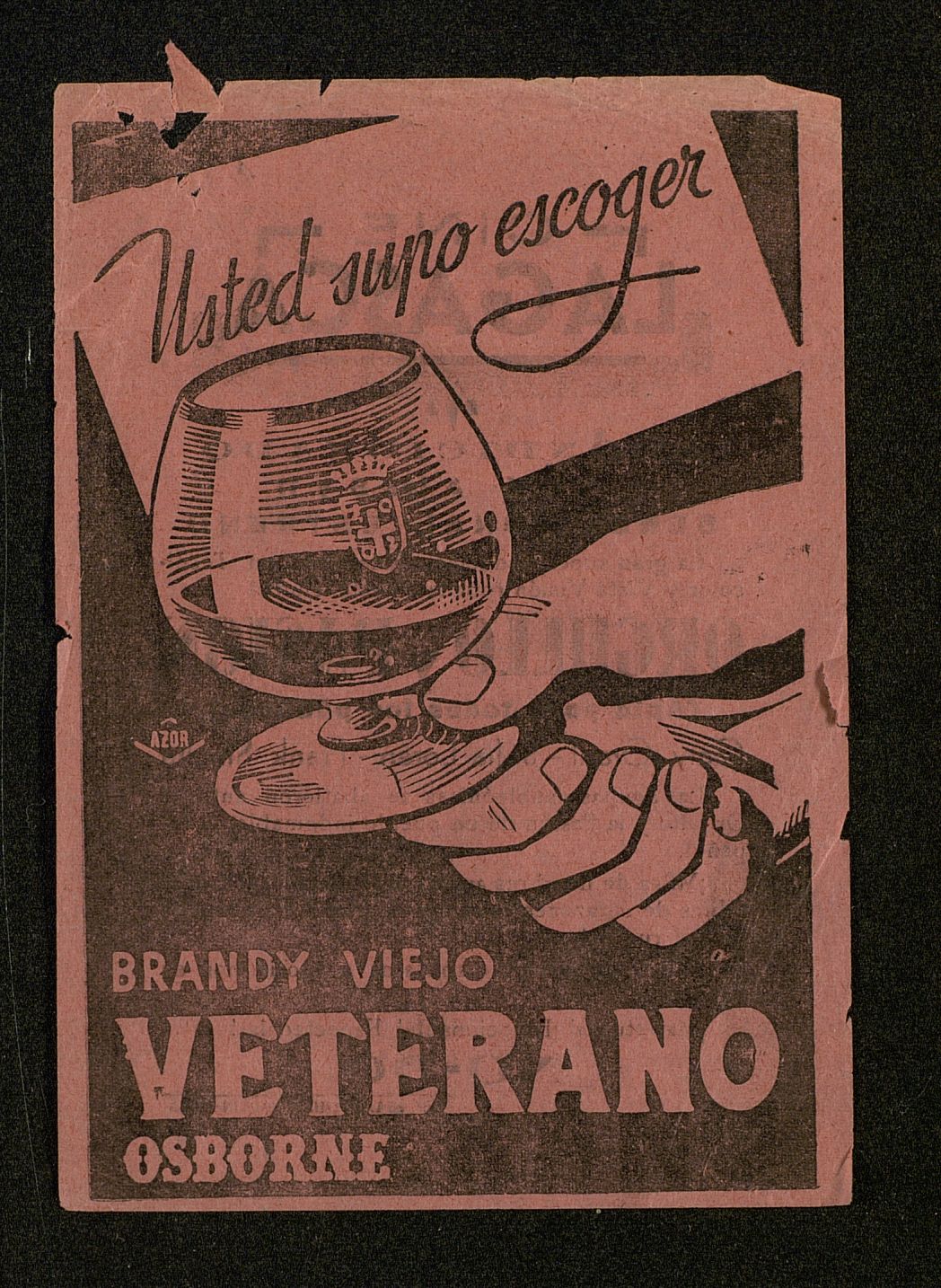 Usted supo escoger, Brandy viejo VETERANO. Publicidad verso de la cartelera Cine Lagasca Orgullo y pasión. Rosada