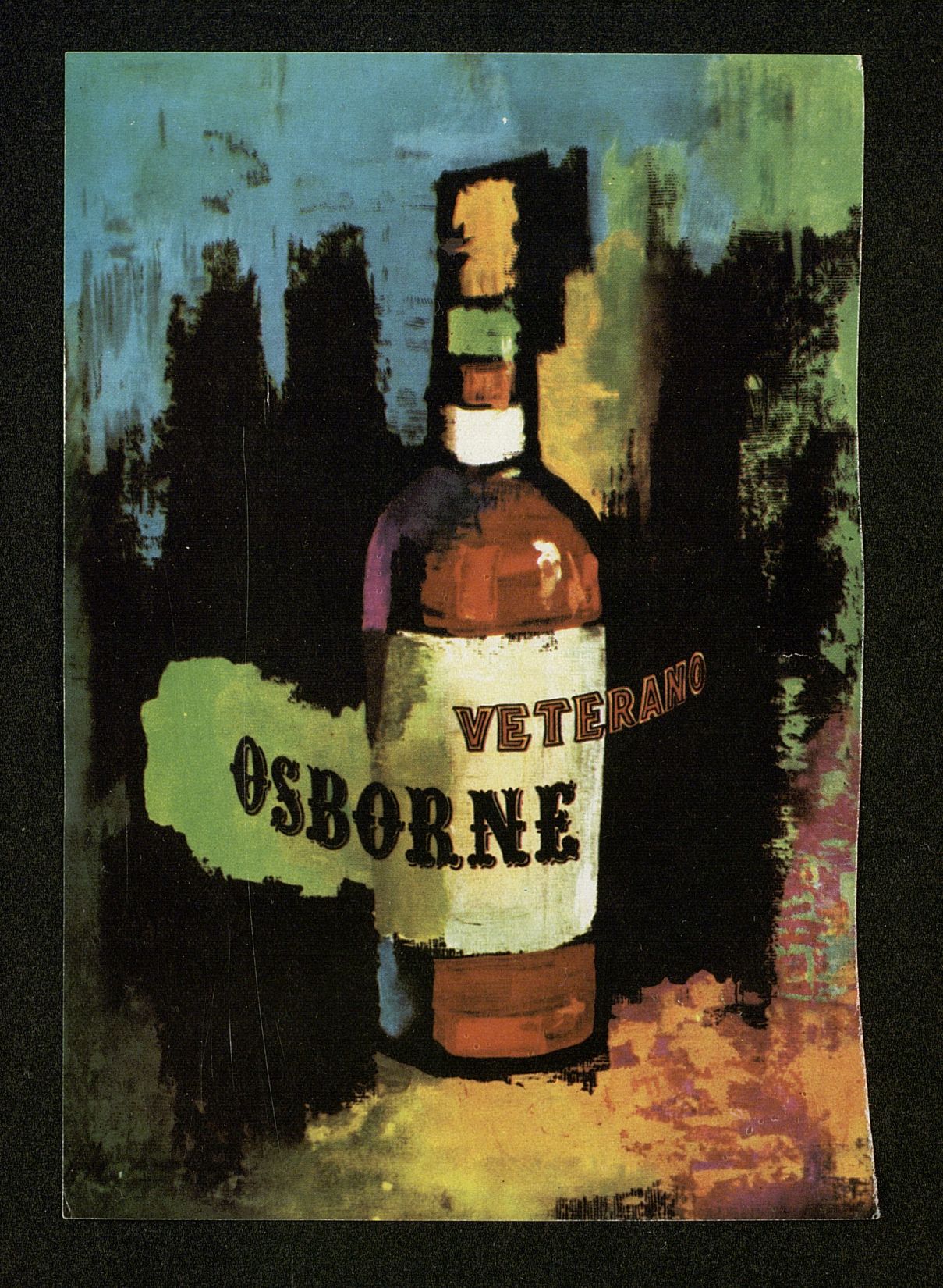 Veterano Osborne. Botalla muy coloreada y fondo de colores negro, azul y verde