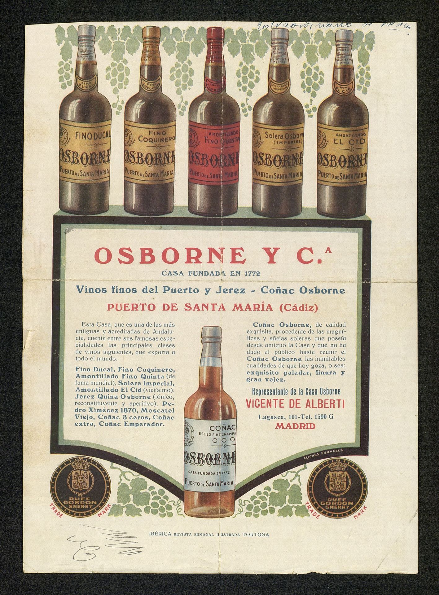 Vinos finos del Puerto y de Jerez, coñac Osborne. Osborne y Cía. Botellas de Fino Dual, Fino Coquinero, Fino Quinta, Solera Osborne, Amontillado El Cid