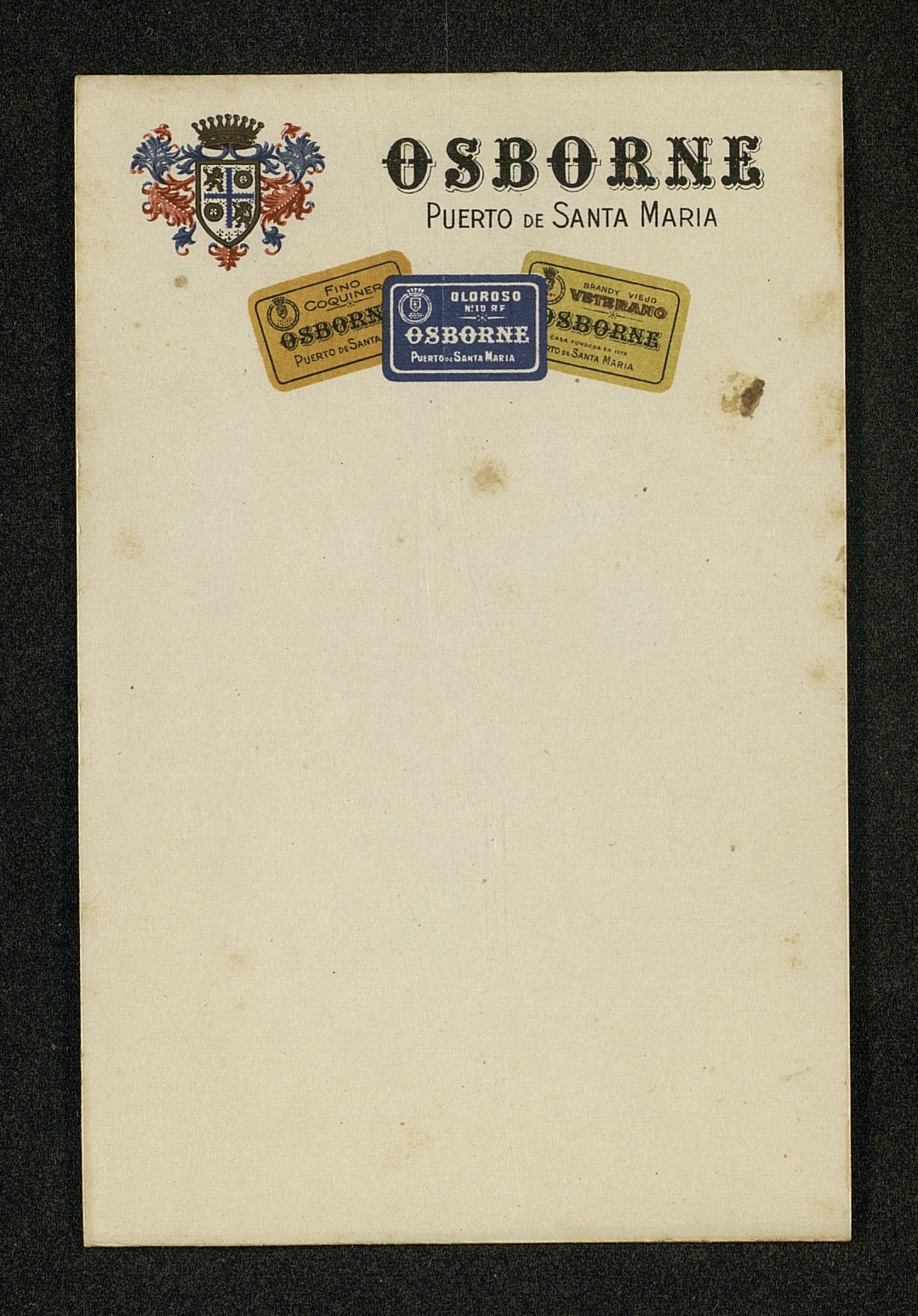 Cuartilla de anotaciones con el escudo de Osborne y etiquetas de Fino Coquinero, Oloroso N10 R.F. Y Brandy Viejo Veterano