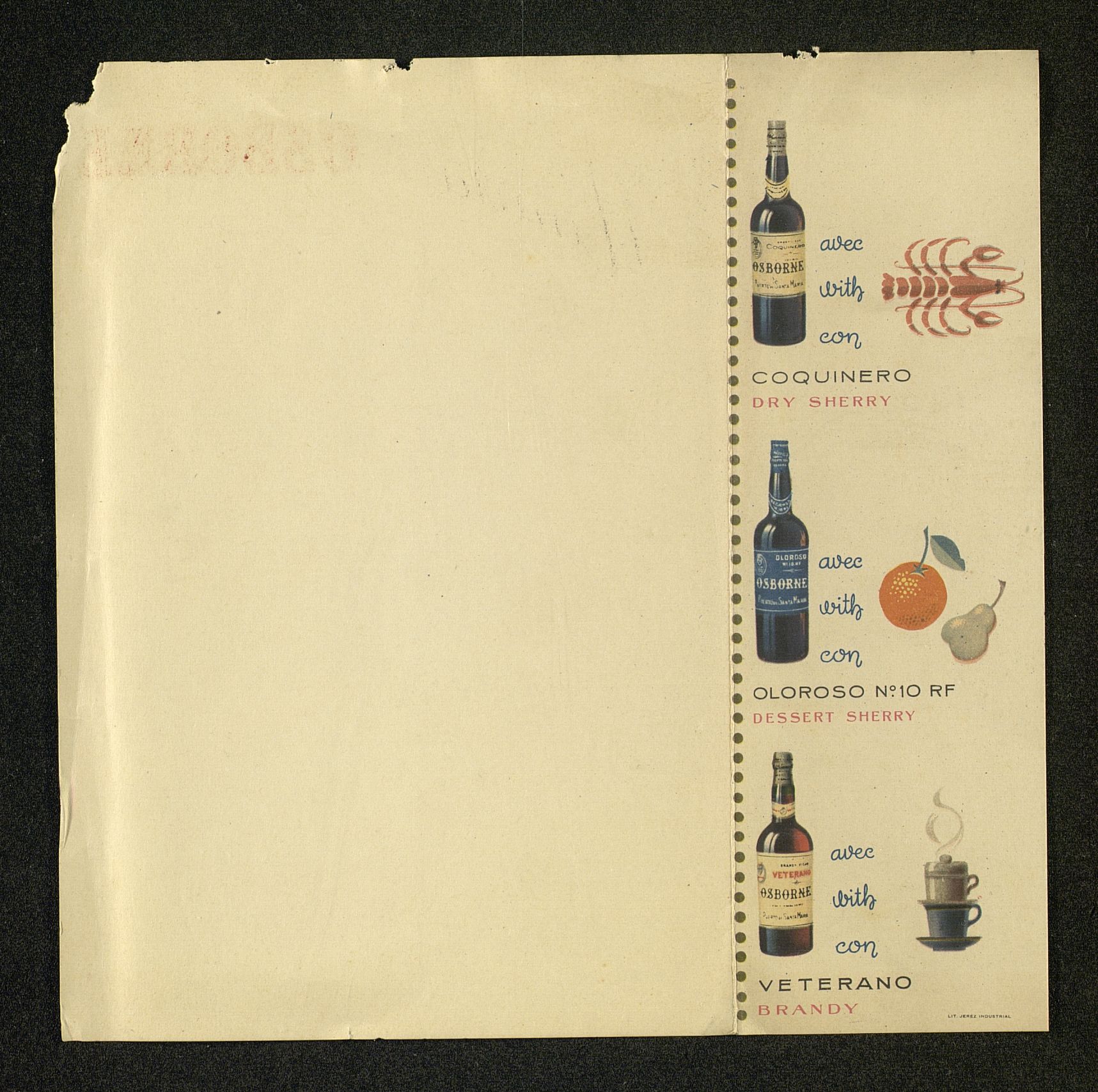 Minuta para anotaciones con el texto en francés. Botella de Coquinero, Oloroso N10 R.F. y Veterano