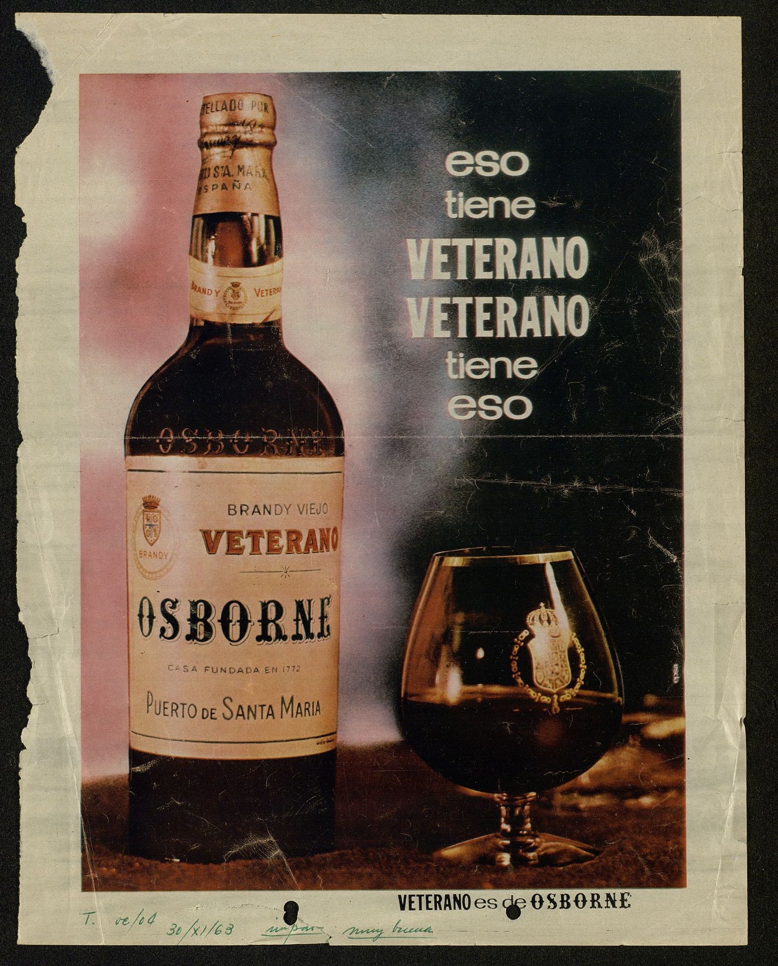 Eso tiene Veterano, Veterano tiene eso. Botella Veterano y copa con el escudo Osborne